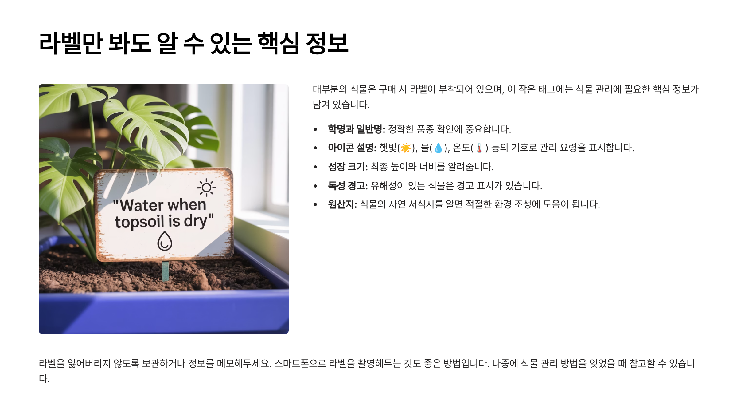 라벨을 무심코 지나치지 말고, 구매 전 꼼꼼히 확인하는 습관을 들여보세요. 꼭 읽어야 할 중요한 정보가 다 담겨 있으니까요. 이런 습관은 식물을 오래 건강하게 키우는 데 큰 도움이 된답니다.