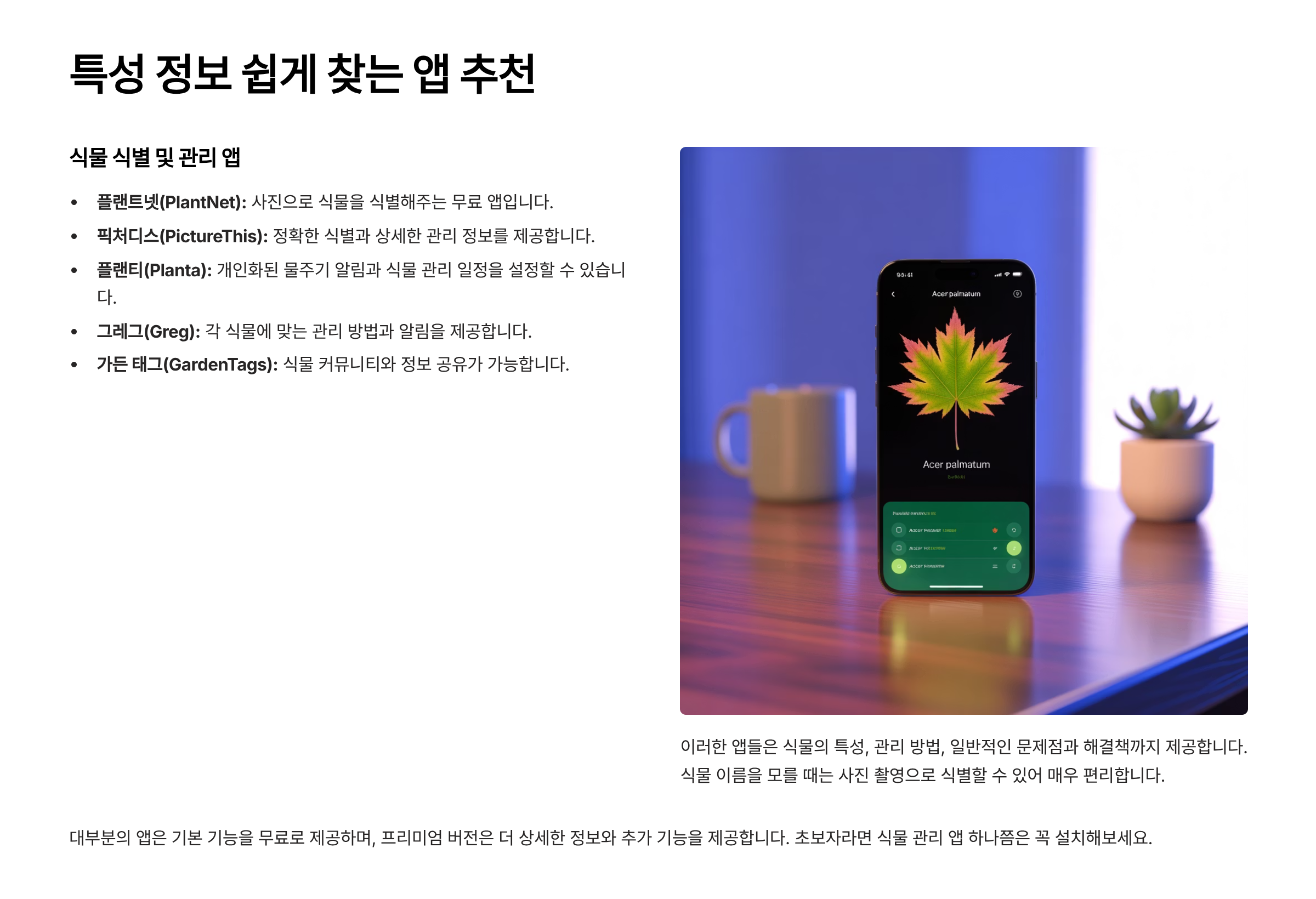 요즘은 스마트폰 앱만 잘 활용해도 식물 키우기가 훨씬 쉬워졌어요. 특히 초보자에게는 식물 이름만 입력하면 자동으로 키우는 방법을 알려주는 앱들이 진짜 유용하답니다. 🧠
