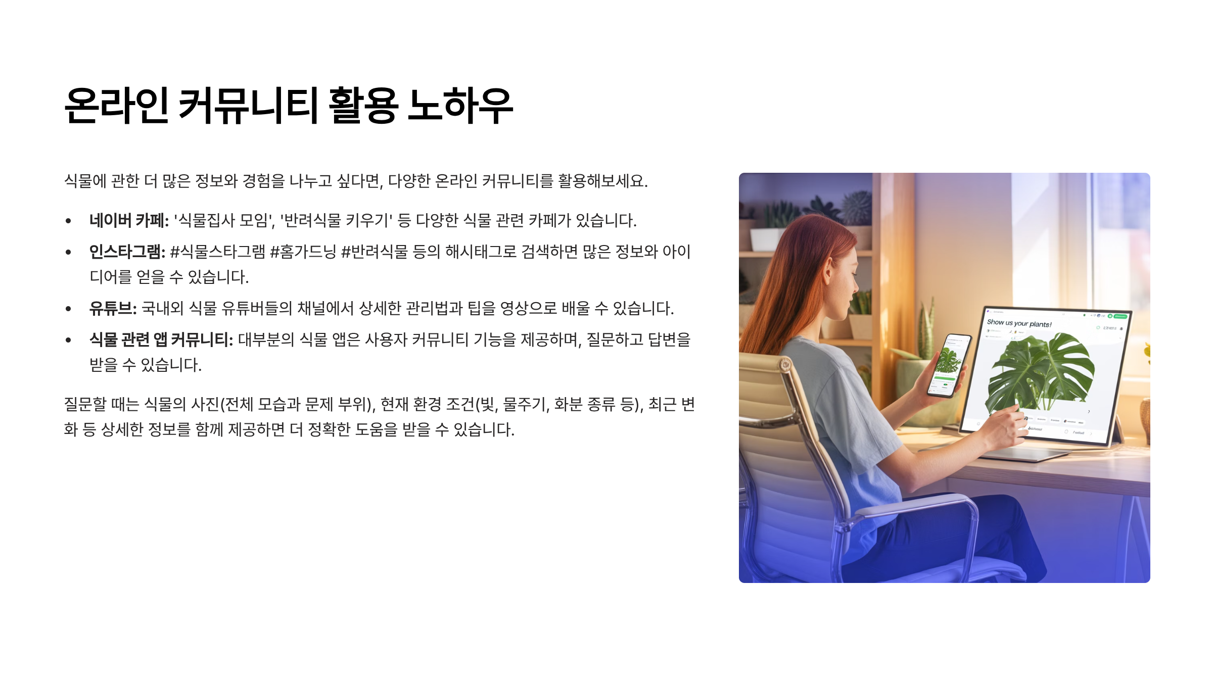 온라인 커뮤니티는 식물 키우기에 있어서 보물 같은 존재예요. 키우다 궁금한 점이 생겼을 때 제일 빠르게 답을 찾을 수 있는 곳이 바로 커뮤니티죠! 💬