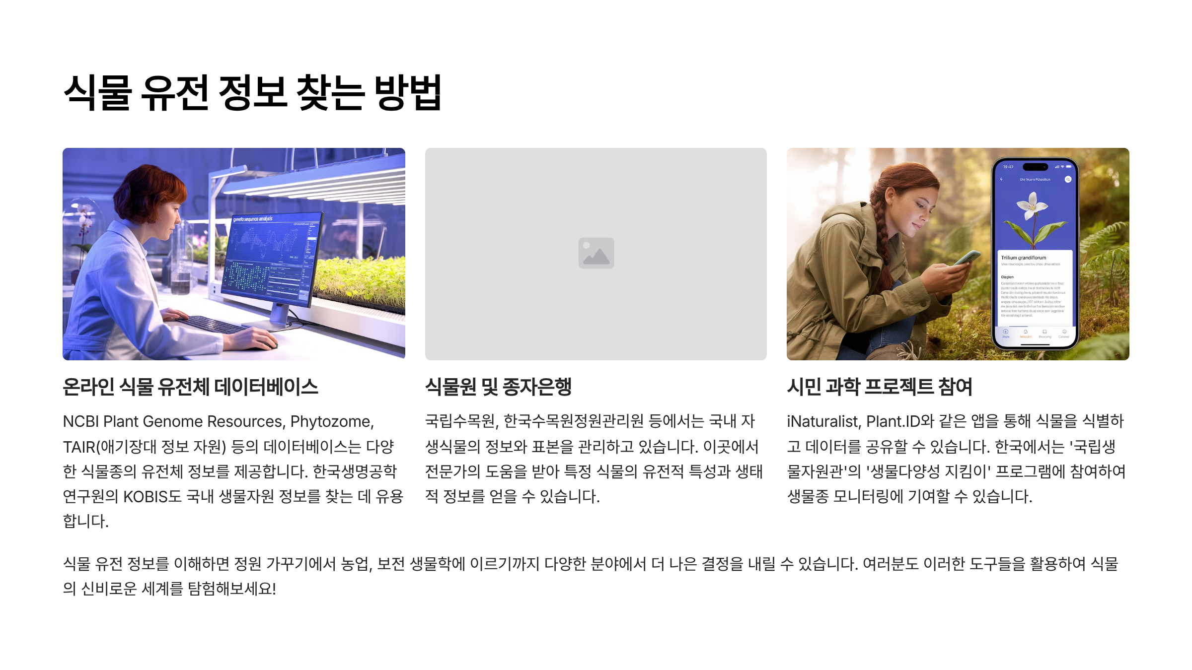 유전 정보를 아는 건 단순한 학문을 넘어서, 기후변화에 대응하고 생물 다양성을 지키는 데도 큰 역할을 해요. 기술의 도움을 받아 식물의 유전 정보를 자유롭게 검색하고 활용해보세요.📡