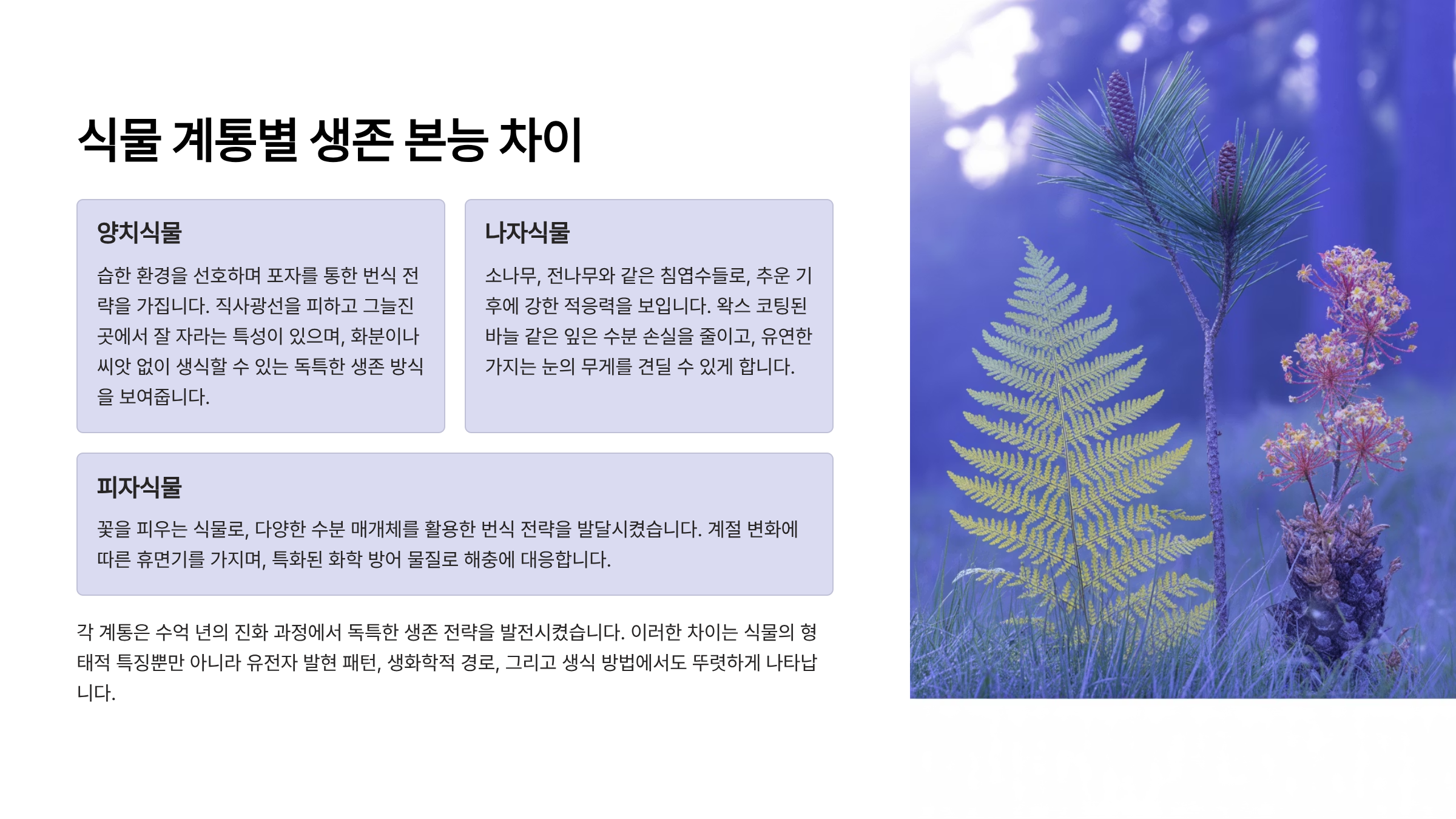 | 식물 계통 | 주요 생존 전략 | 대표 식물 |