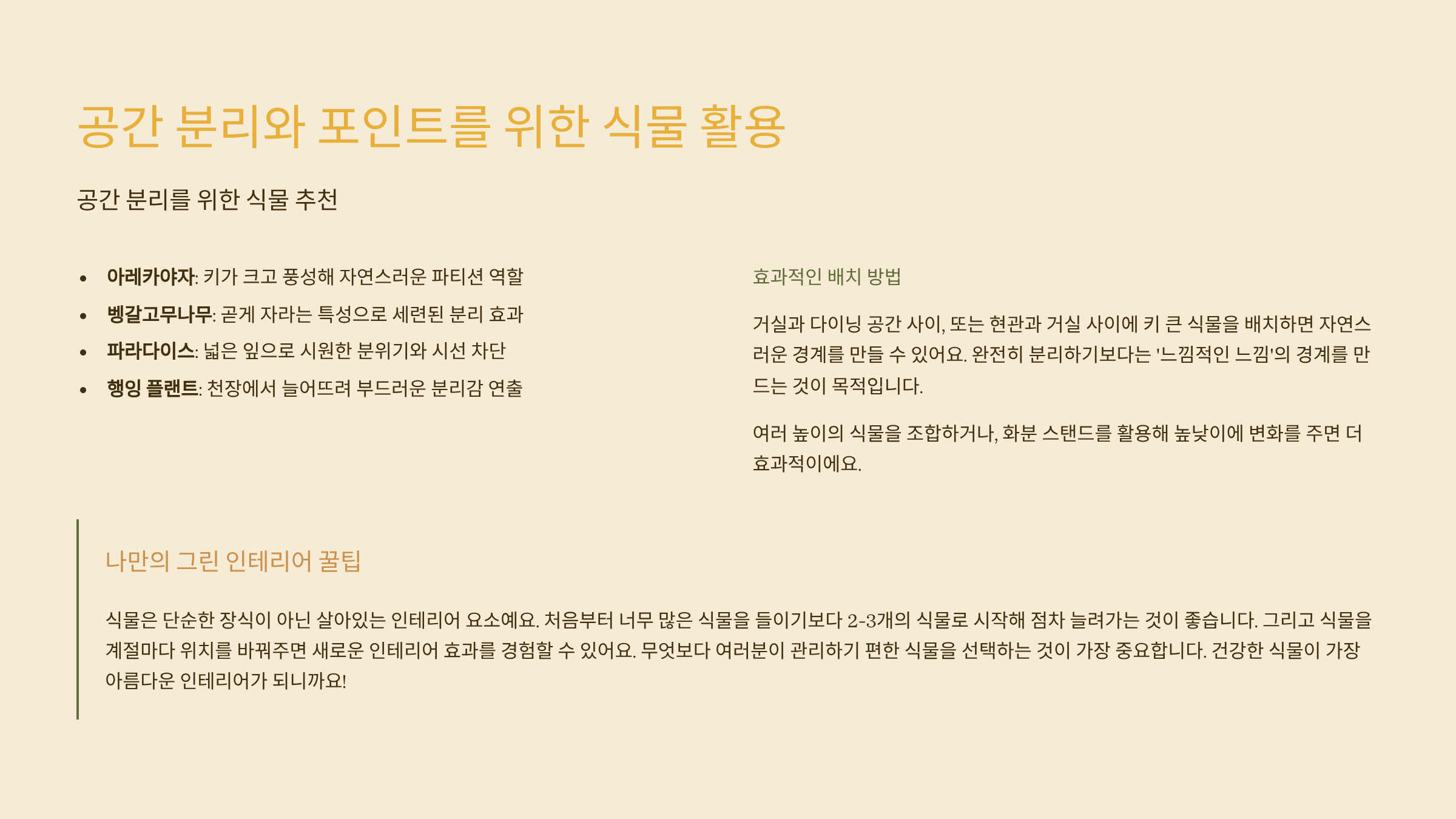 | 공간 분리 | 드라세나, 고무나무 | 폭이 넓고 내구성 강함 |