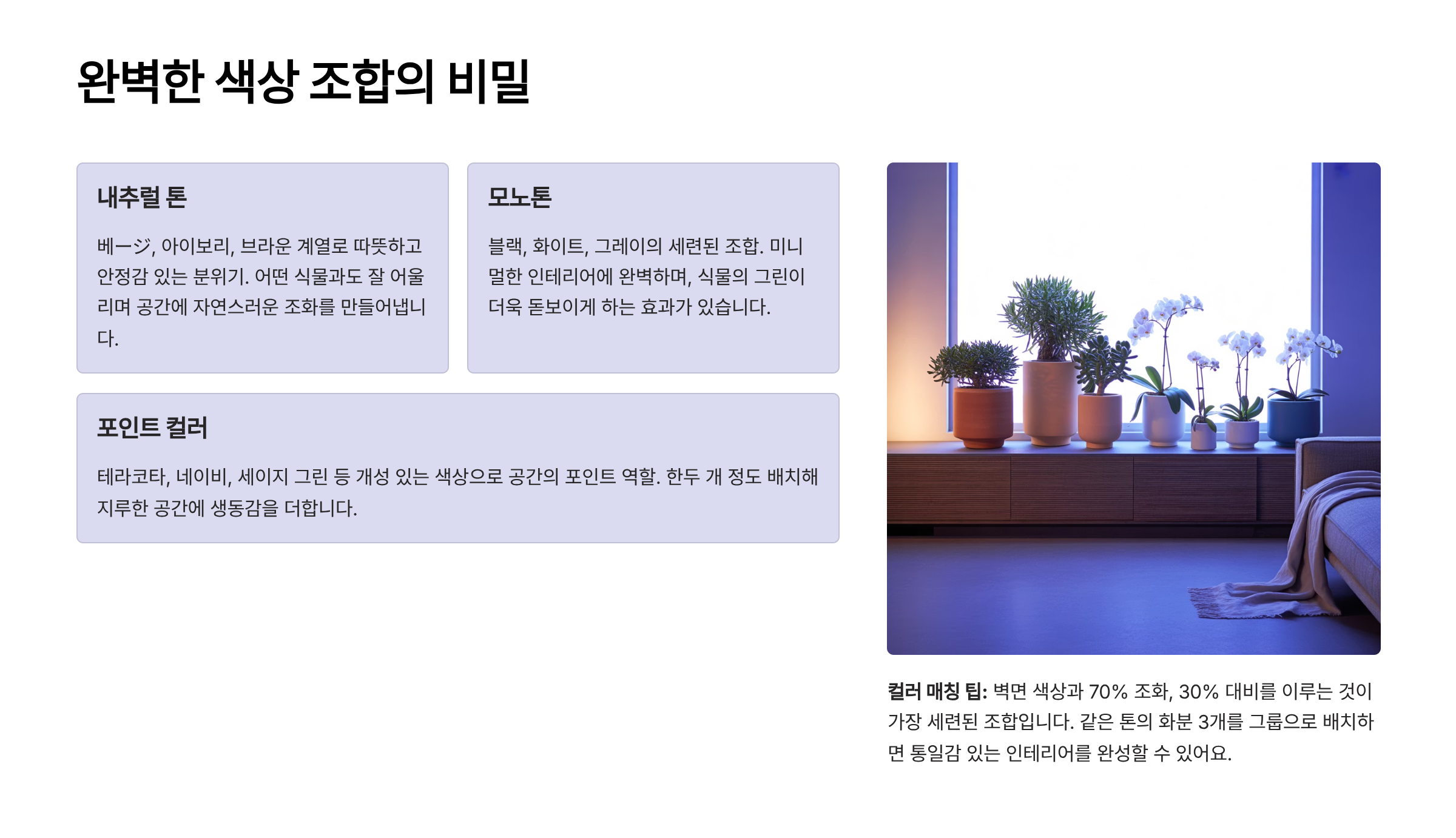 식물 색과 배경 벽 색상까지 함께 고려해서 화분 색상을 골라보면 더 멋진 조화를 만들 수 있답니다 🌿💡