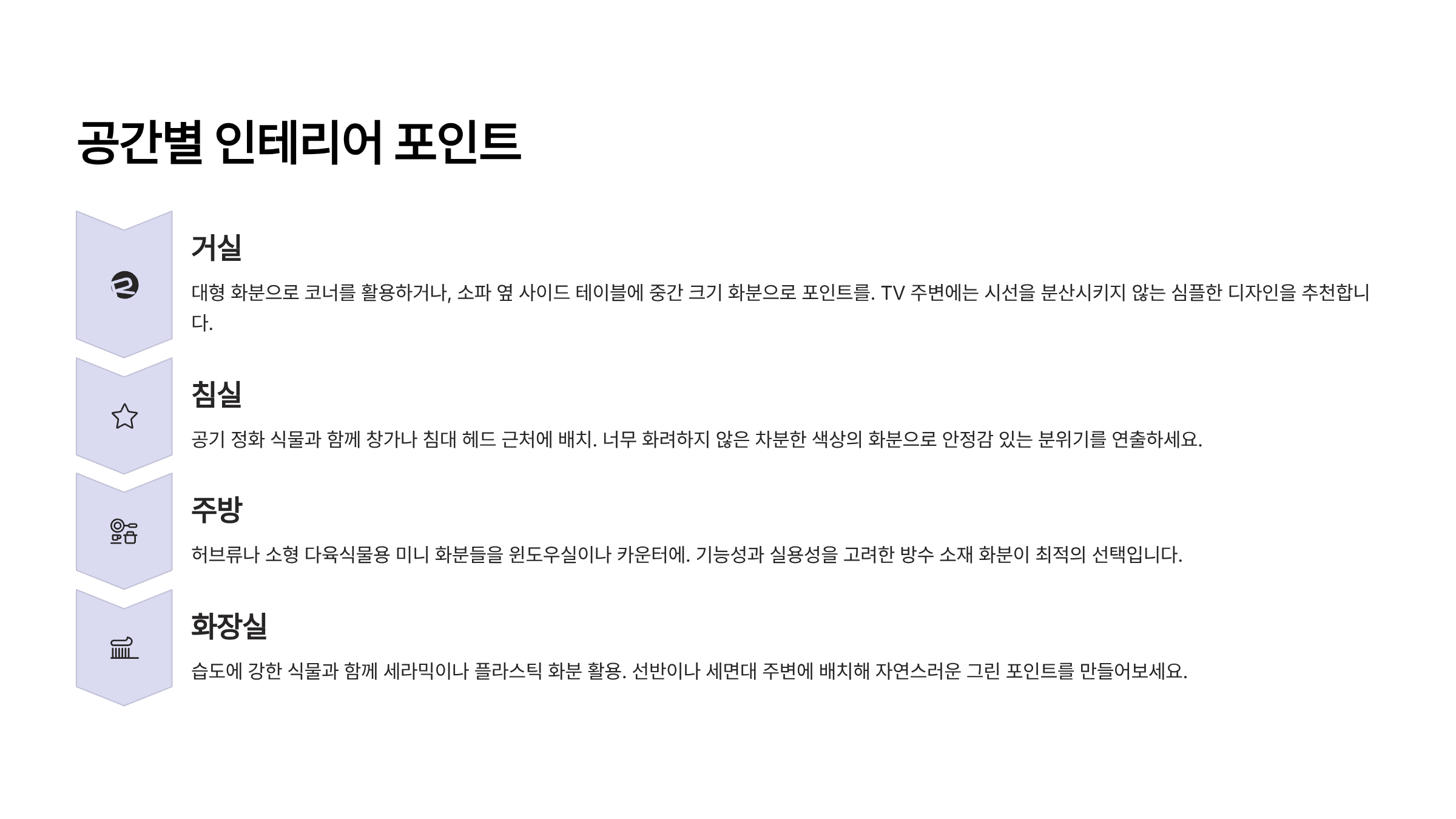 | 모던/시크 | 블랙, 메탈릭, 콘크리트 | 산세베리아, 페페로미아 |