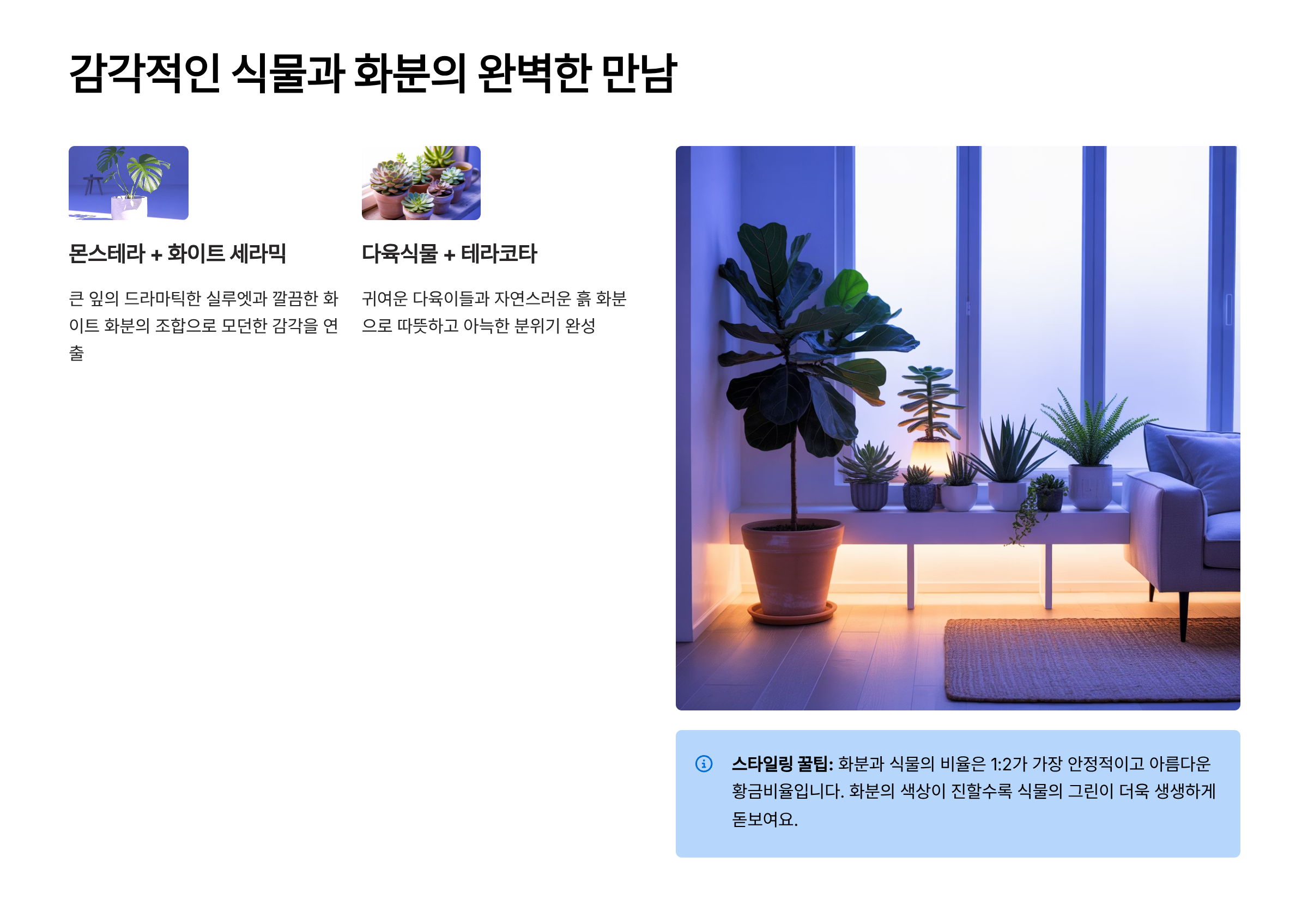 | 공간 스타일 | 추천 화분 색상 | 어울리는 식물 |