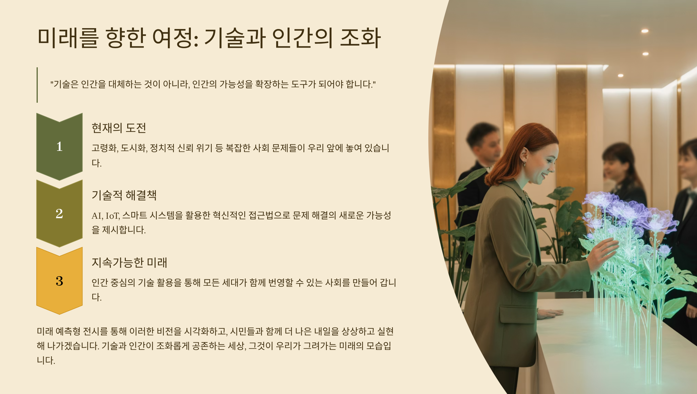 예를 들어 ‘효율 중심’을 선택한 사람은 AI와 로봇이 모든 걸 대신하는 도시를 만나고, ‘공존 중심’을 선택한 사람은 사람과 자연이 균형을 이루는 사회로 향했어요. 전시는 관람자에게 단순한 정보가 아닌, ‘선택의 책임감’까지 체험하게 했죠.