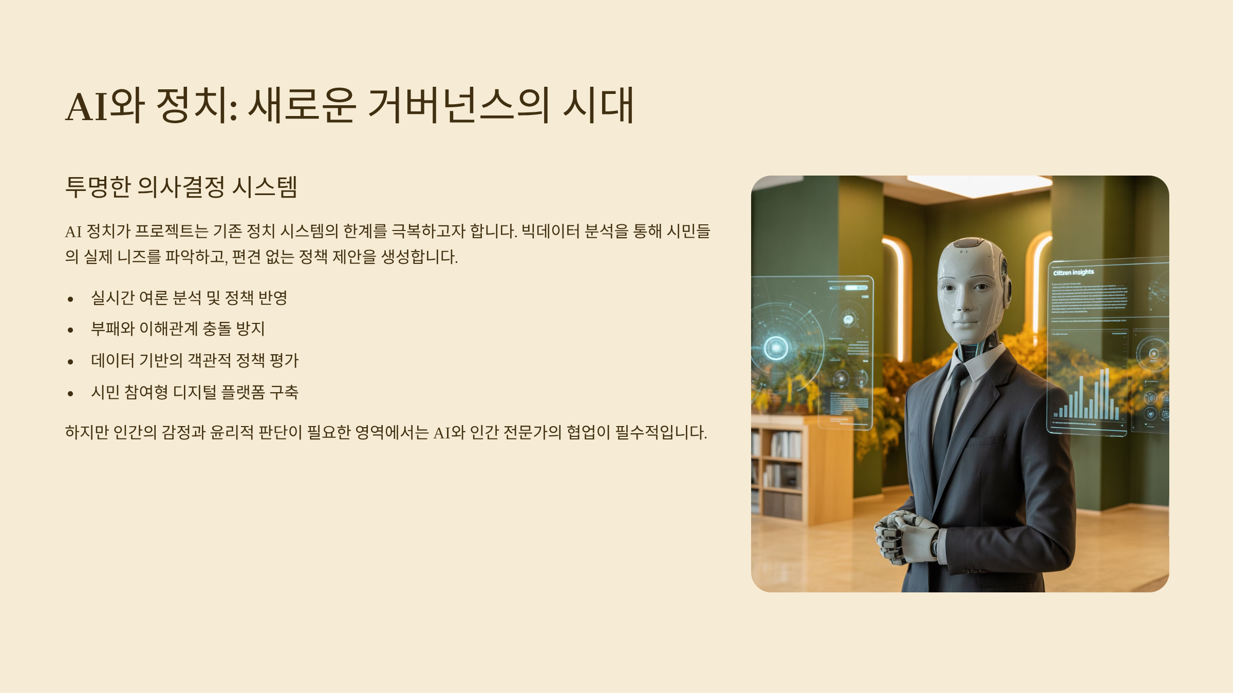 AI 정치가는 민주주의의 미래를 다시 생각하게 해요. 참여 기반 민주주의의 한계를 AI가 보완할 수 있을지, 또 정치 신뢰 회복의 대안이 될 수 있을지에 대한 실험적인 시도였답니다.