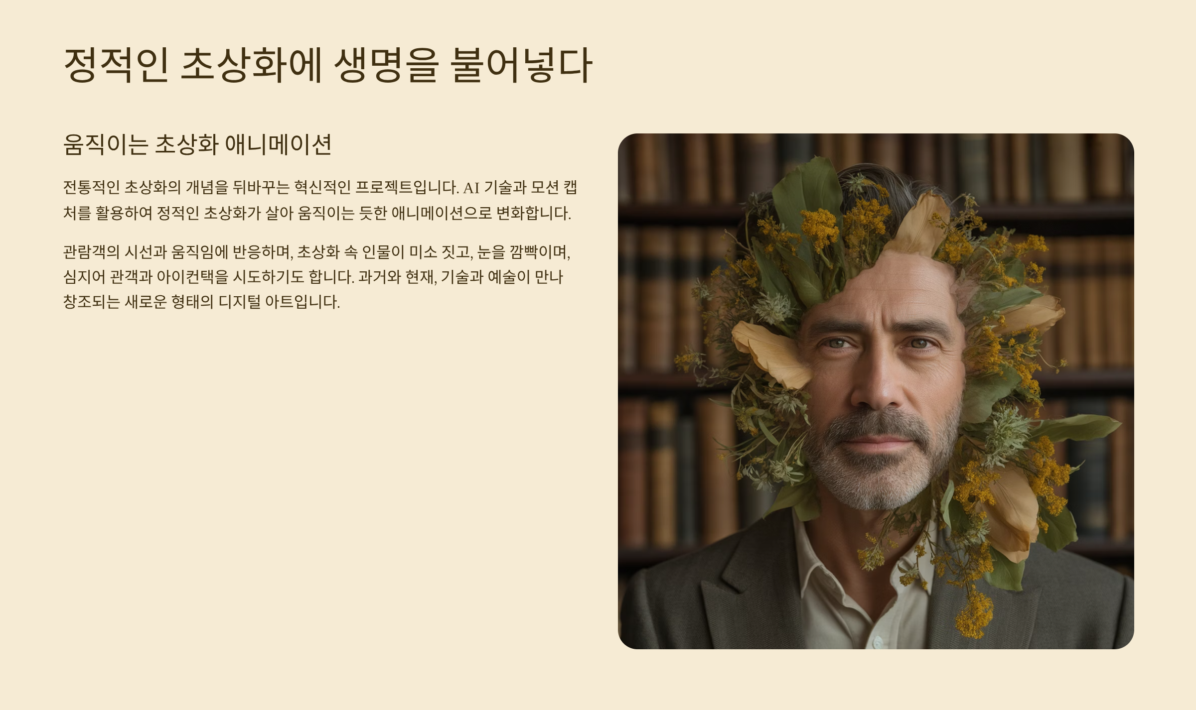 2025년 졸업전시 중 가장 큰 화제를 모은 작품 중 하나는 바로 ‘움직이는 초상화 애니메이션’이에요. 이 작품은 단순한 회화 작품을 넘어서, 사람의 감정을 담은 초상화를 애니메이션처럼 살아 움직이게 만든 프로젝트예요. 보는 사람에 따라 그 표정과 배경이 실시간으로 변화하는 인터랙티브 기술이 핵심이죠.