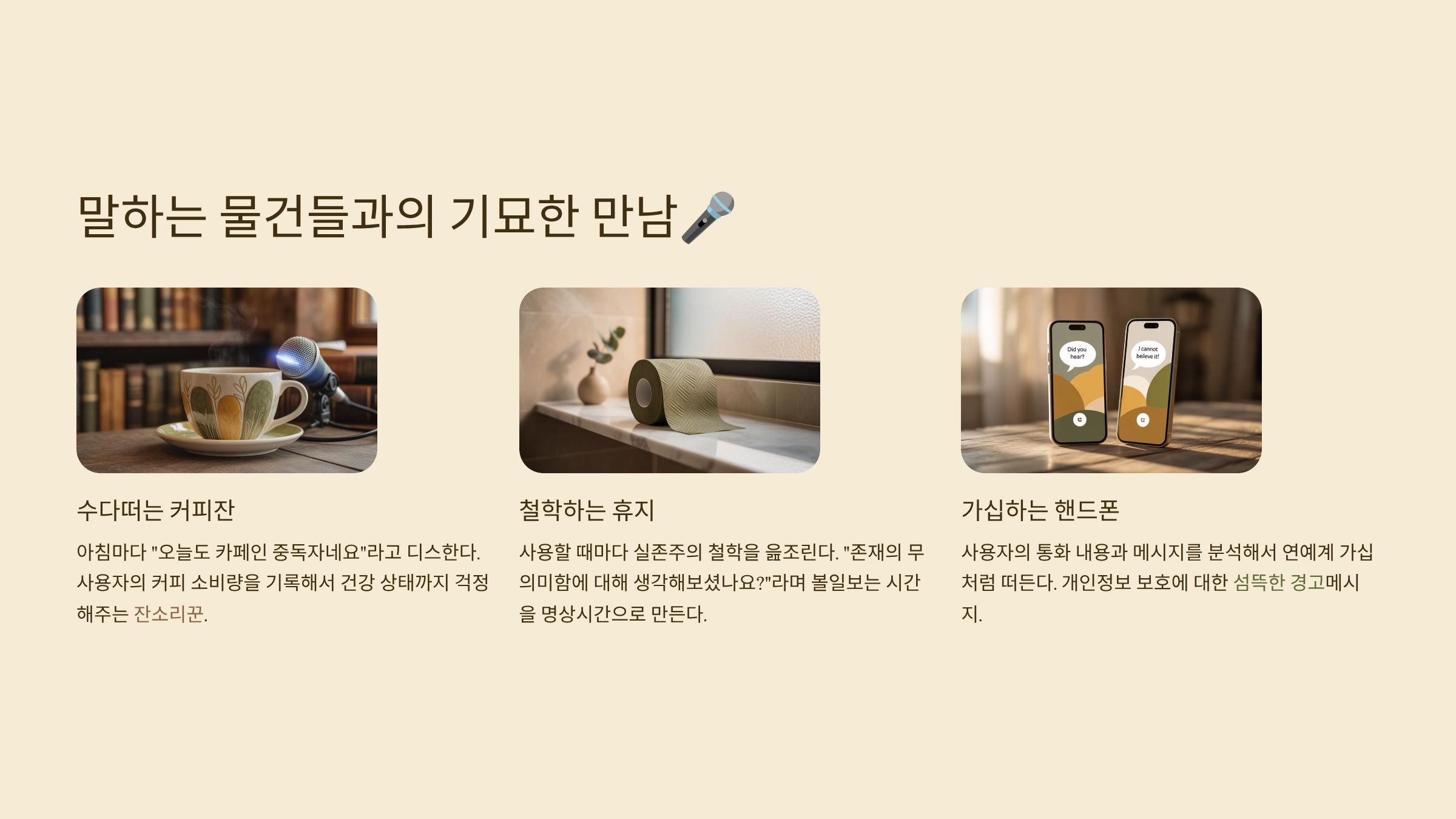 관람객은 물건과 마주 앉아, 질문을 고르면 해당 물건의 사연을 들을 수 있었어요. 이 작품은 기술, 연기, 조명, 음향이 합쳐져 오감으로 느끼는 설치물이었어요. 가볍게 시작해도 끝나면 마음이 묵직해지는 마법 같은 작품이었답니다.