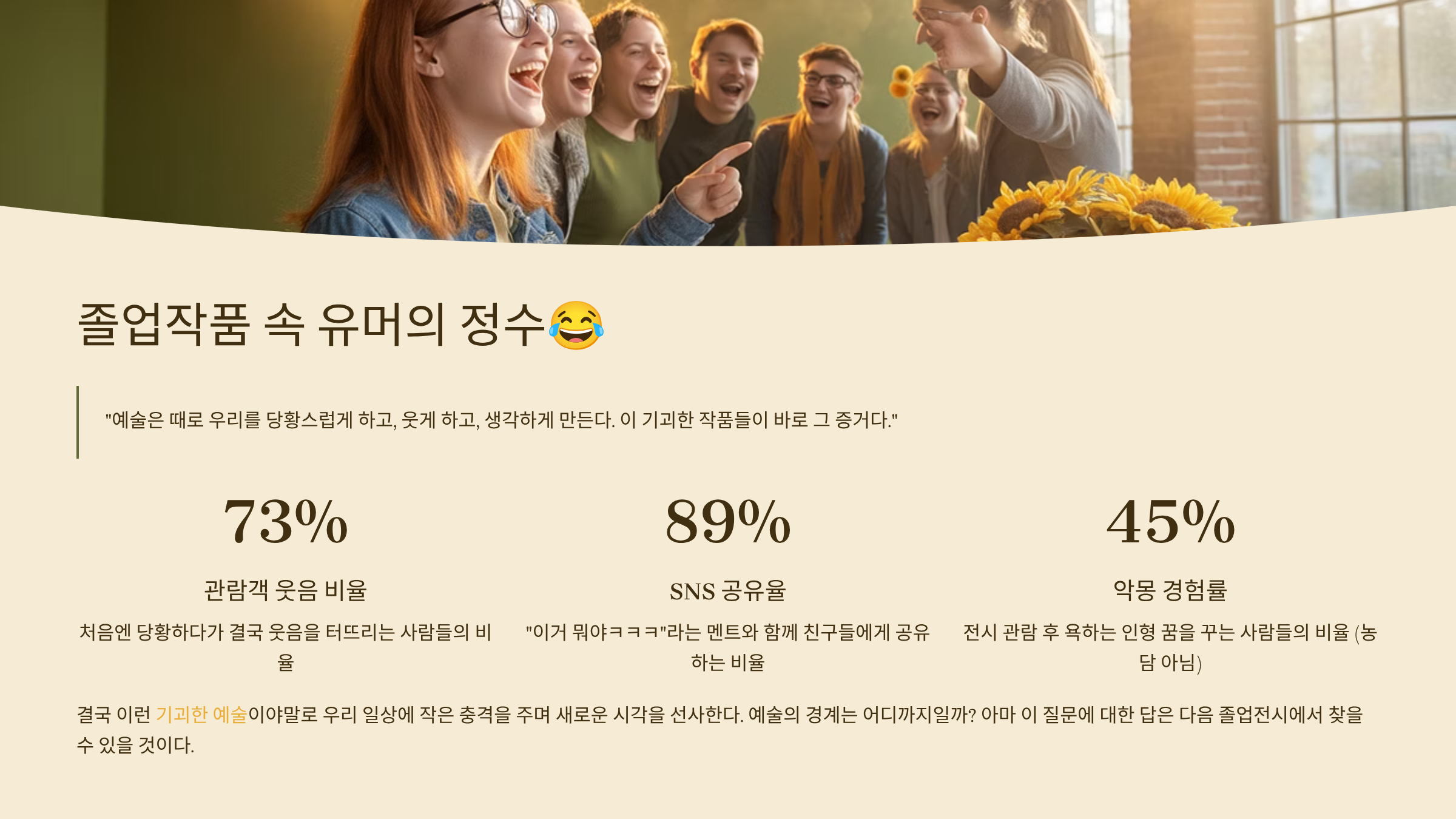 결과적으로 이 전시는 사람들에게 웃음을 선물했지만, 그 안에는 시대를 살아가는 젊은 창작자들의 진지한 시선과 땀이 담겨 있었어요. 관객이 즐겁게 소통하고, 가볍게 들어와 무겁게 나가는 그런 인상 깊은 졸업전시회였답니다. 🎓