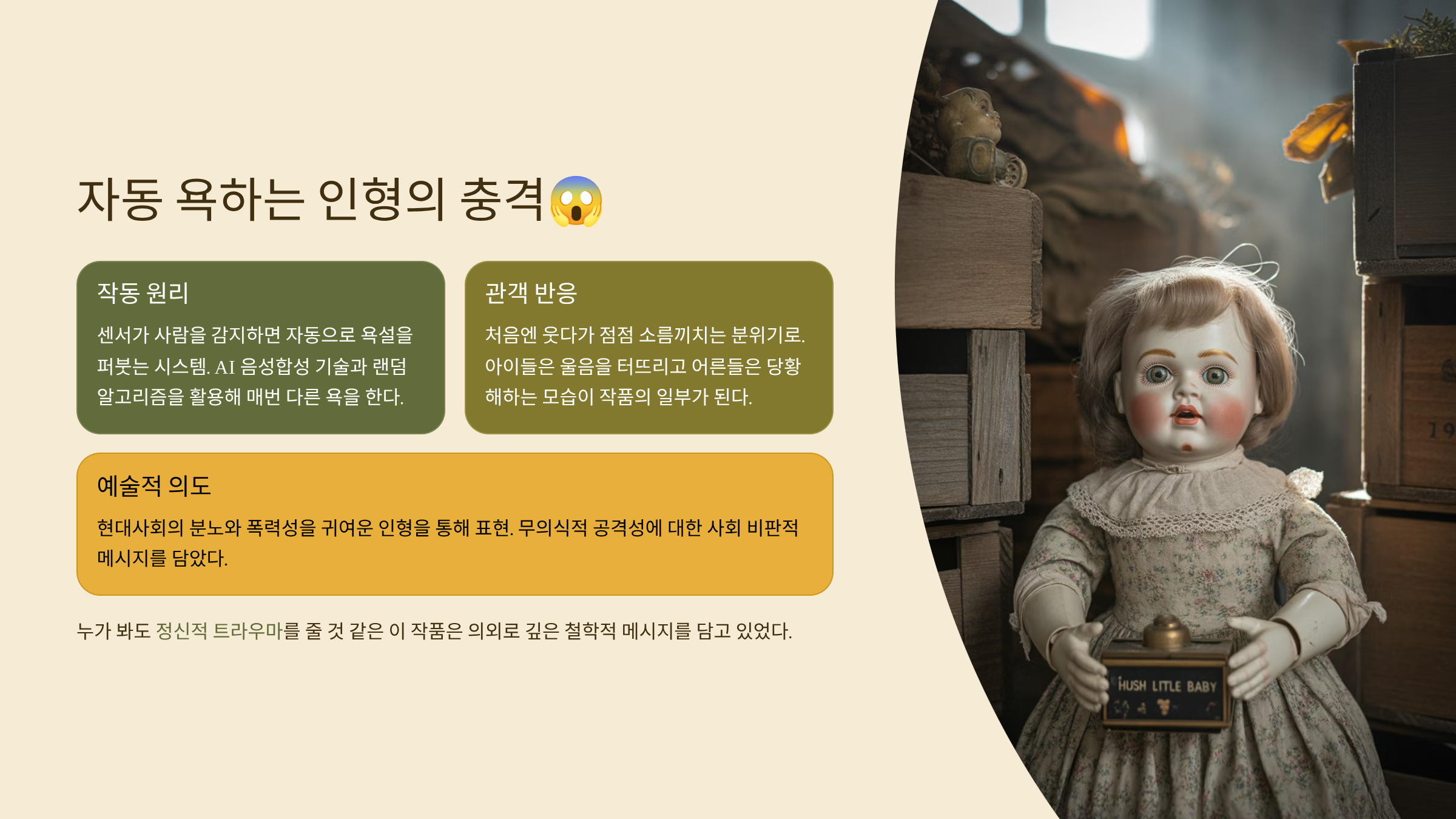 심리학적 개입 요소도 포함돼 있었어요. 분노 표출이 어려운 한국 사회의 특성을 풍자한 설치물로, 관객이 직접 피드백을 남기며 전시회 내내 핫한 반응을 얻었어요. 😆