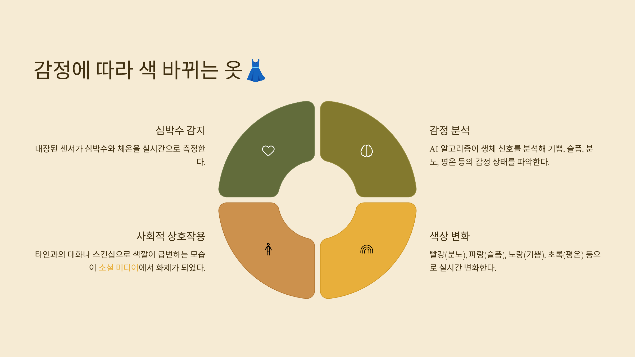 센서는 손목에서 심박수, 땀, 체온을 감지하고, 데이터는 마이크로칩으로 전송돼 옷의 소재에 붙은 색상 LED나 크로모패브릭이 반응하는 방식이에요. 빨간색은 분노, 파란색은 안정, 초록은 기쁨, 보라는 혼란을 나타내더라고요.