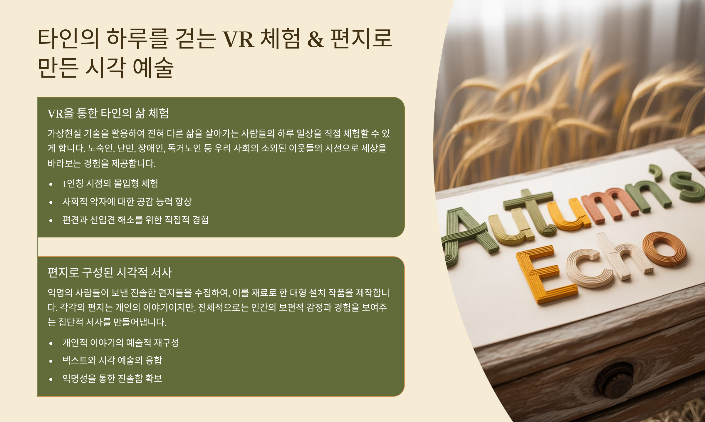 | 편지 기반 아트 | 관계, 정서 | 잔잔한 감동과 여운 전달 |