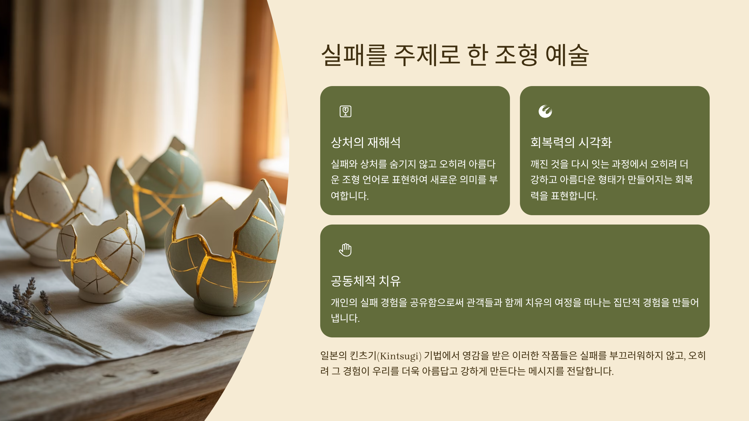 ‘실패’를 예술로 전환하는 건 단지 고통을 드러내는 게 아니에요. 오히려 그것을 통해 성장한 자신을 이야기하고, 보는 이에게도 “괜찮다”고 말하는 방식이에요. 이런 작업은 단순한 조형미를 넘어서 서사와 치유를 동시에 담을 수 있어요 🌱