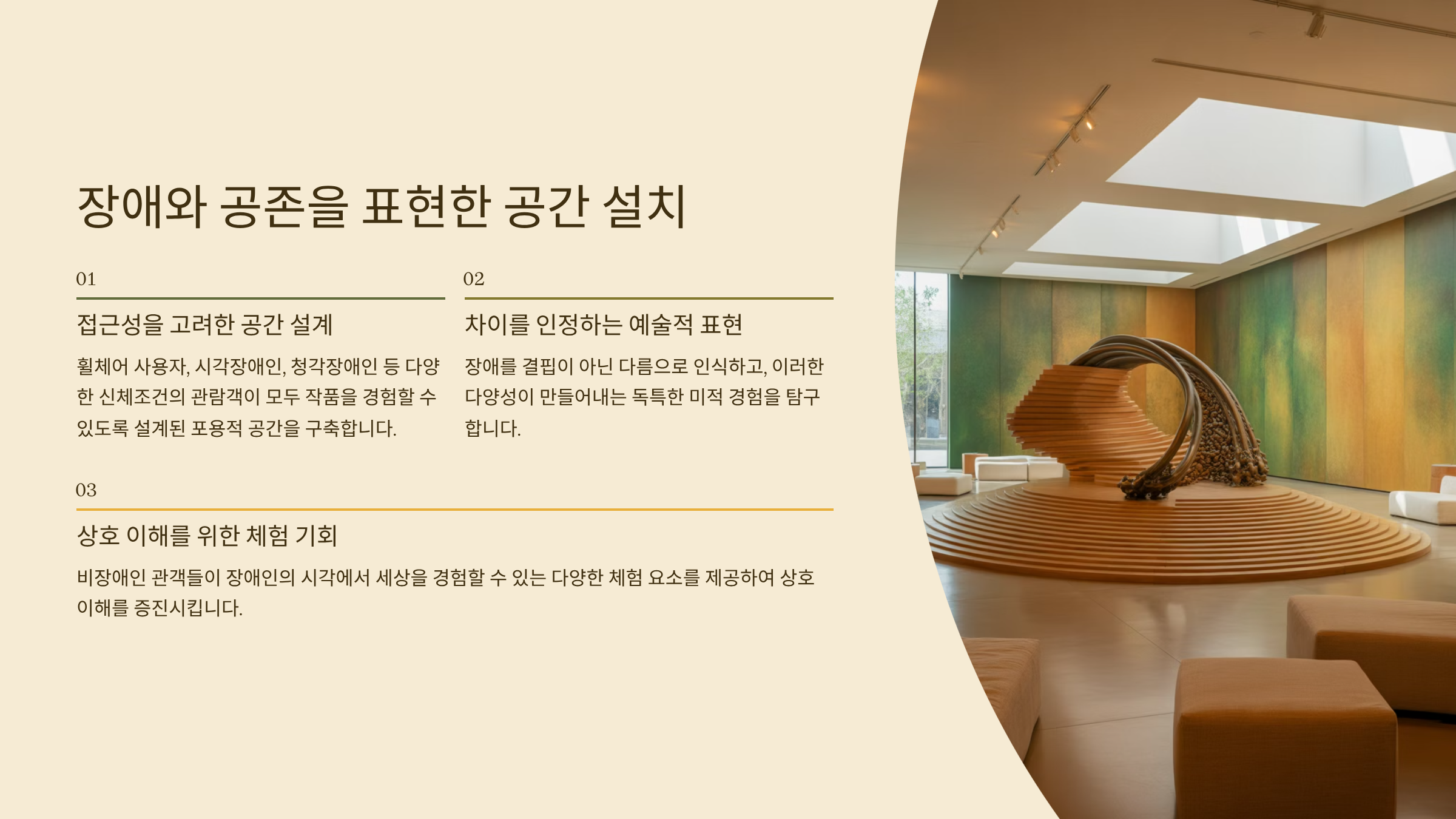 장애와 공존은 단순한 테마가 아니라, 우리가 살아가는 사회의 지속 가능성과도 연결되는 주제예요. 이런 주제를 공간에 풀어낸다는 건 예술을 통한 공공 담론의 시작이라고 할 수 있어요. 그만큼 깊은 고민과 따뜻한 시선이 담겨야 진정한 공감으로 연결될 수 있답니다.