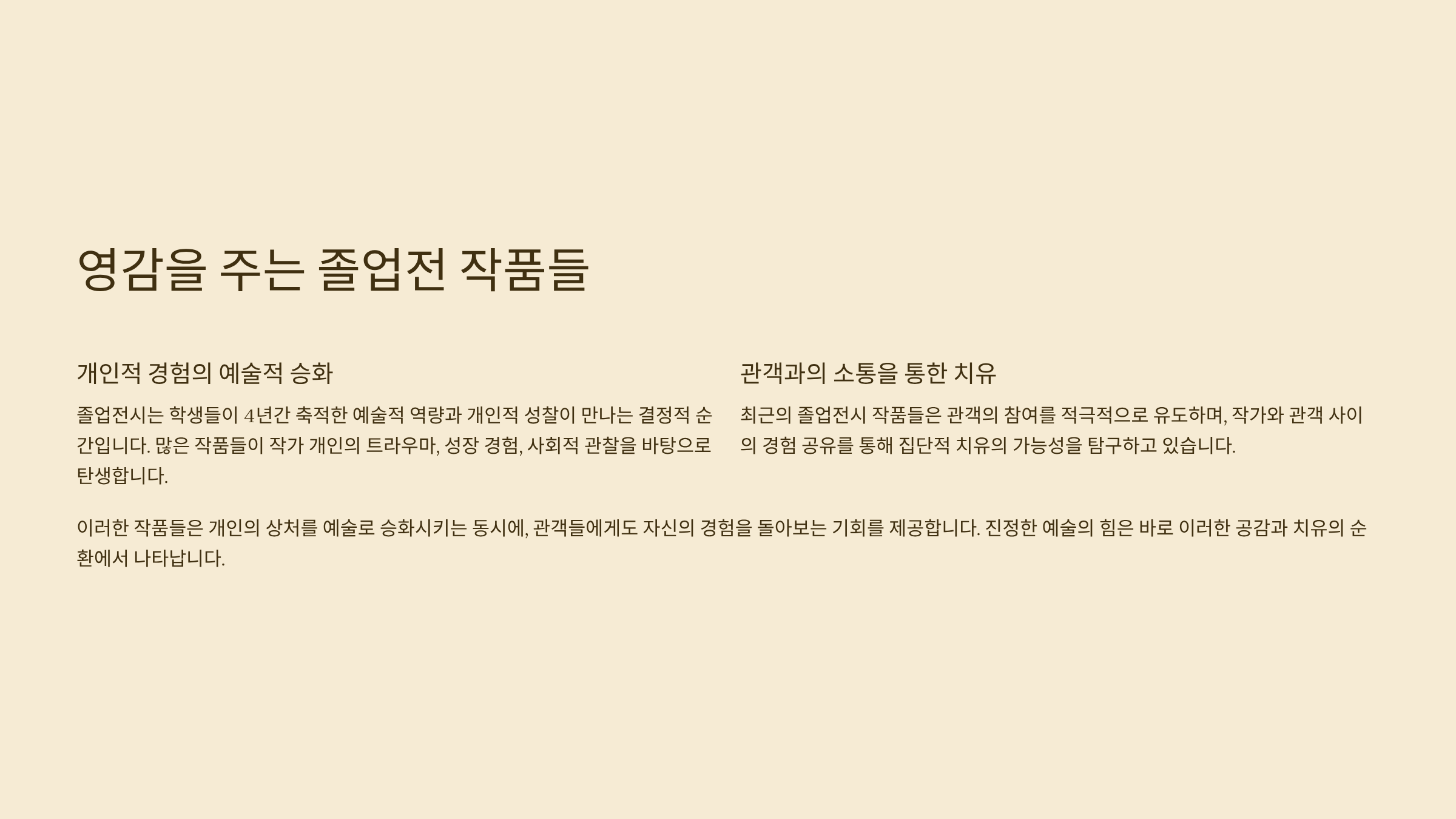 예술은 치유예요. 전시를 보는 이가 자신을 다시 들여다보고, 마음에 여백을 만들 수 있다면 그것만으로도 작품은 충분히 성공한 거예요. 공감과 위로를 중심에 두고 작품을 구성해보는 것도 졸업전의 멋진 방향이 될 수 있어요 🌸