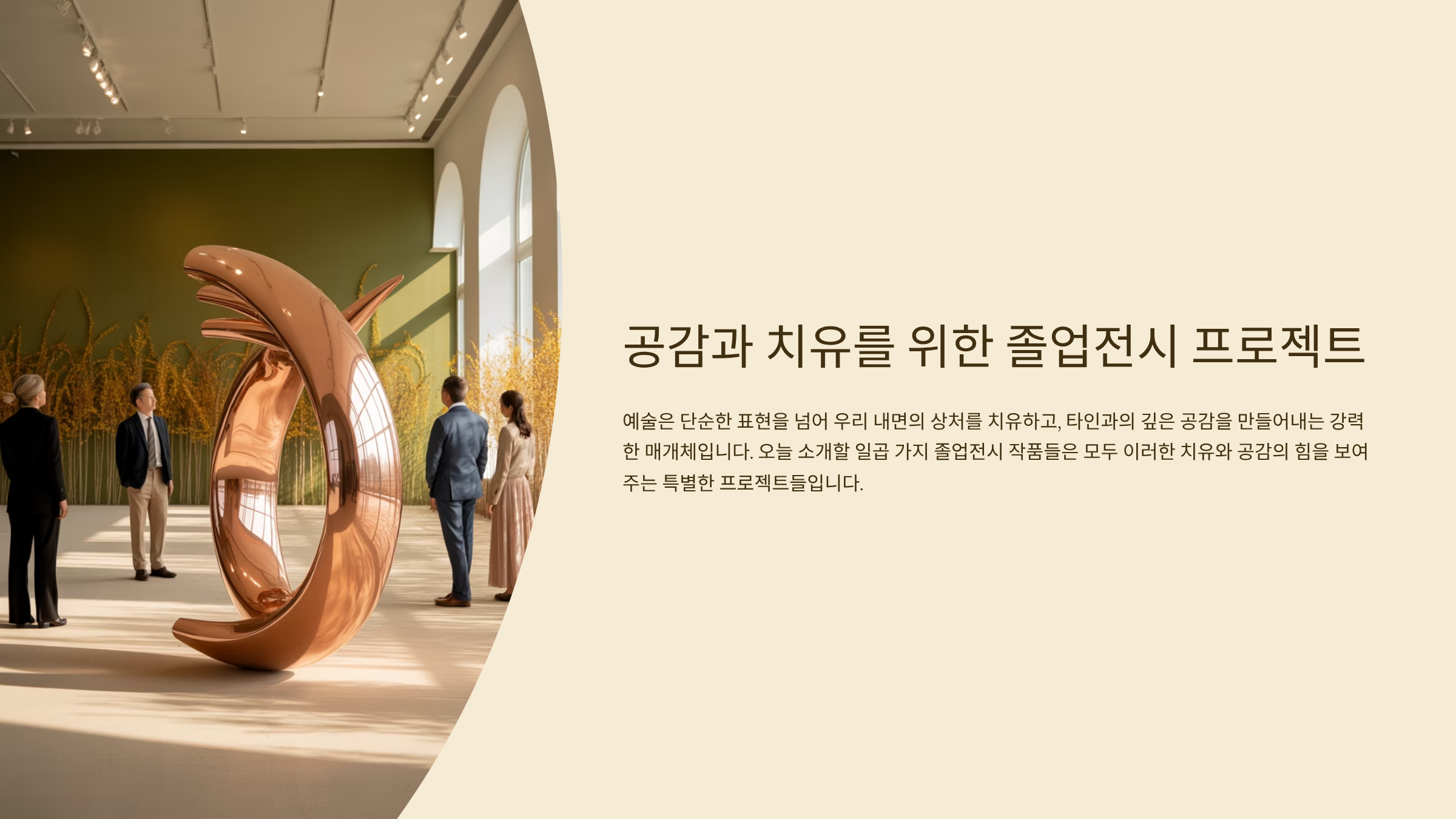 예술은 치유예요. 전시를 보는 이가 자신을 다시 들여다보고, 마음에 여백을 만들 수 있다면 그것만으로도 작품은 충분히 성공한 거예요. 공감과 위로를 중심에 두고 작품을 구성해보는 것도 졸업전의 멋진 방향이 될 수 있어요 🌸