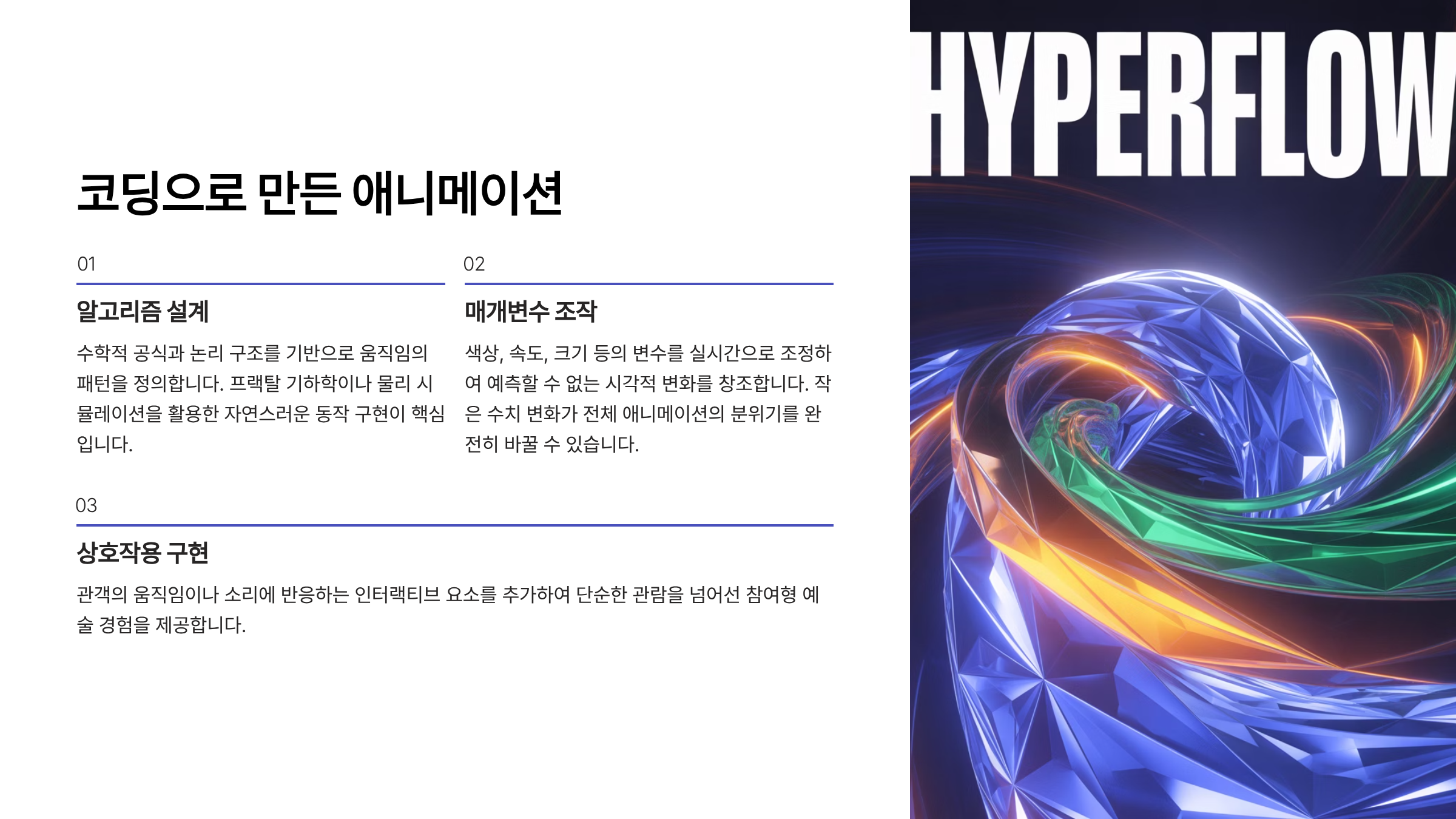 이러한 코딩 기반 애니메이션은 디자이너가 움직임과 사운드를 '구현'하는 수준을 넘어서, '설계자' 혹은 '감독'으로 역할이 바뀐다는 점이 핵심이에요. 예술과 기술의 경계를 허물며 새로운 표현의 장을 열고 있었죠.
