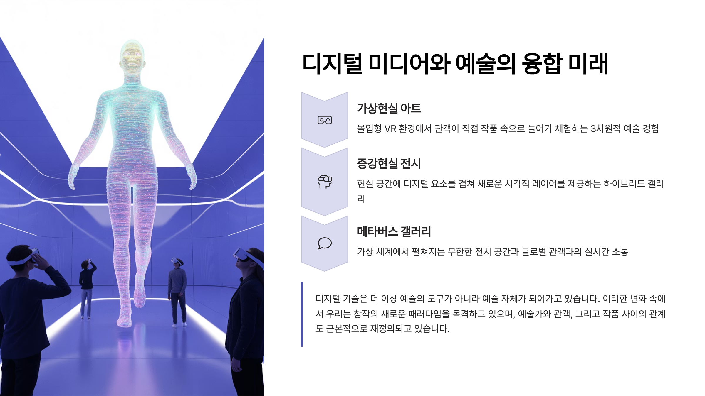 디지털 미디어는 예술을 보다 열려있고, 실험적이고, 관객 참여형으로 바꾸고 있어요. 더 이상 ‘그림’이나 ‘영상’이라는 틀에 갇히지 않고, 메시지에 맞게 가장 적합한 매체를 조합해내는 거예요. 이건 정말 큰 패러다임 전환이에요.