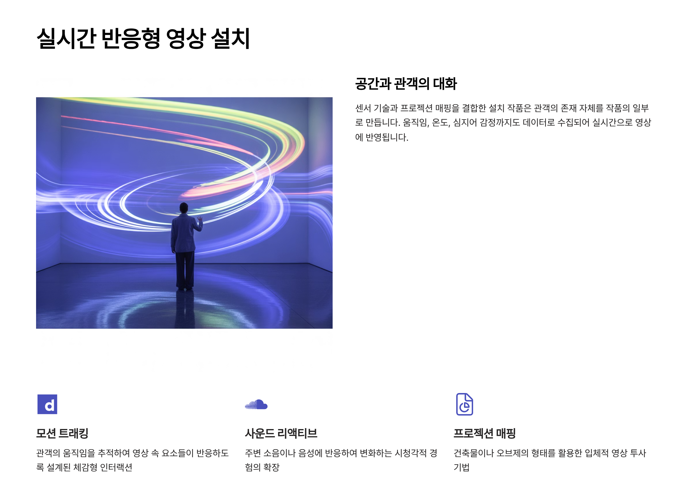 | 영상 + 센서 | 반응형 설치 미디어 | 감각적 몰입 유도 |