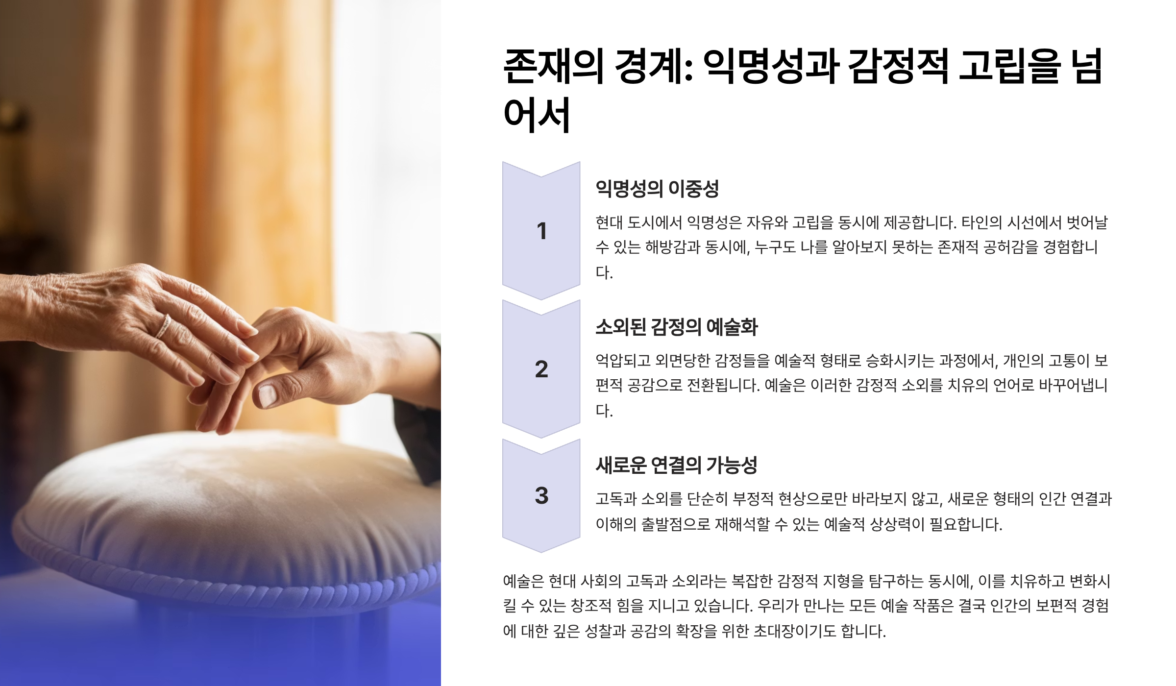 이런 작품을 보면 관람객이 단순히 작품을 보는 것을 넘어서, 자신의 경험과 연결해 생각하게 돼요. ‘소외’가 개인의 문제가 아닌, 구조적이고 관계적인 현상이라는 걸 자연스럽게 깨닫게 되죠.