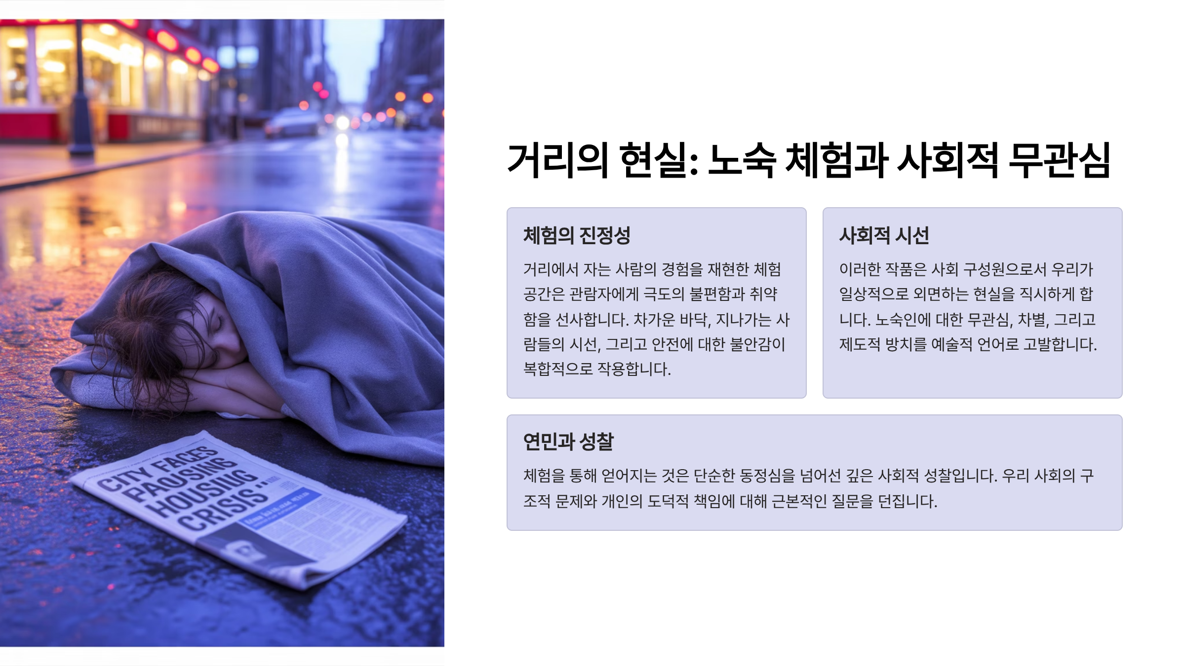 벽면에는 실제 거리 생활자의 인터뷰가 녹음돼 끊임없이 흘러나와요. 낮에는 존재감이 사라지고, 밤에는 공포와 추위 속에 깨어 있는 그들의 목소리는 관람자의 심리를 조용히 무너뜨려요. 의도된 불편함이 작품의 핵심이에요.