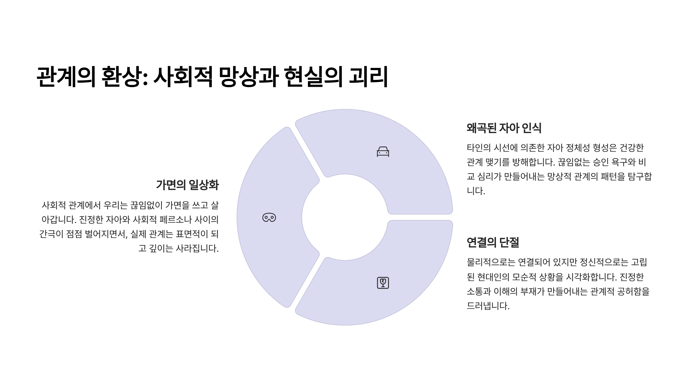 | SNS 기록 | 차단, 단절된 대화 | 디지털 단절 시각화 |