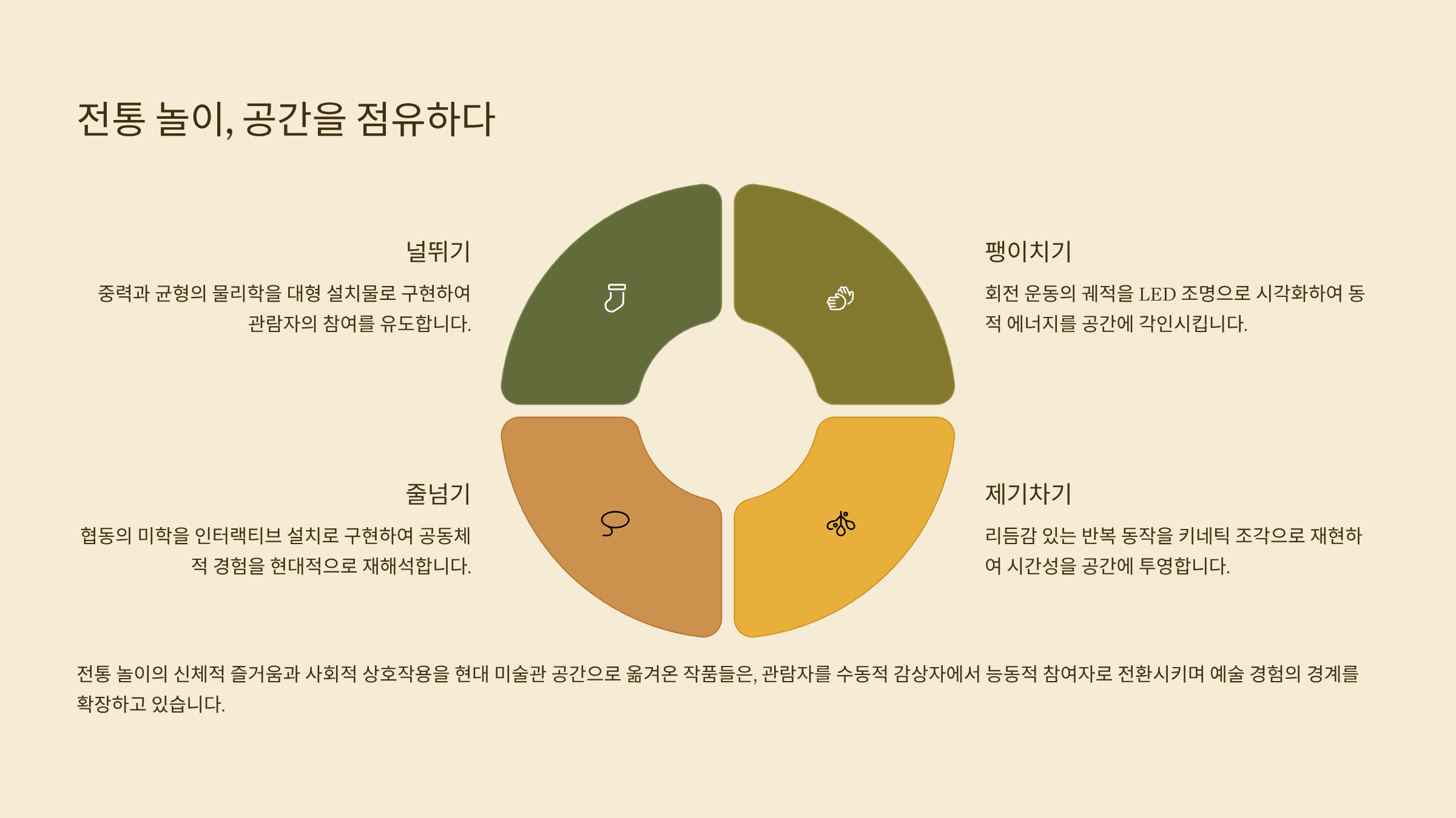 작가는 “이제는 사라진 전통 놀이 속에 공동체성과 감각적 교육이 들어있다”고 했어요. 전통이라는 단어가 올드한 것이 아니라, 그 안에 담긴 가치가 다시 조명받을 수 있도록 ‘체험형 문화 예술’로 풀어낸 거죠. 🧩