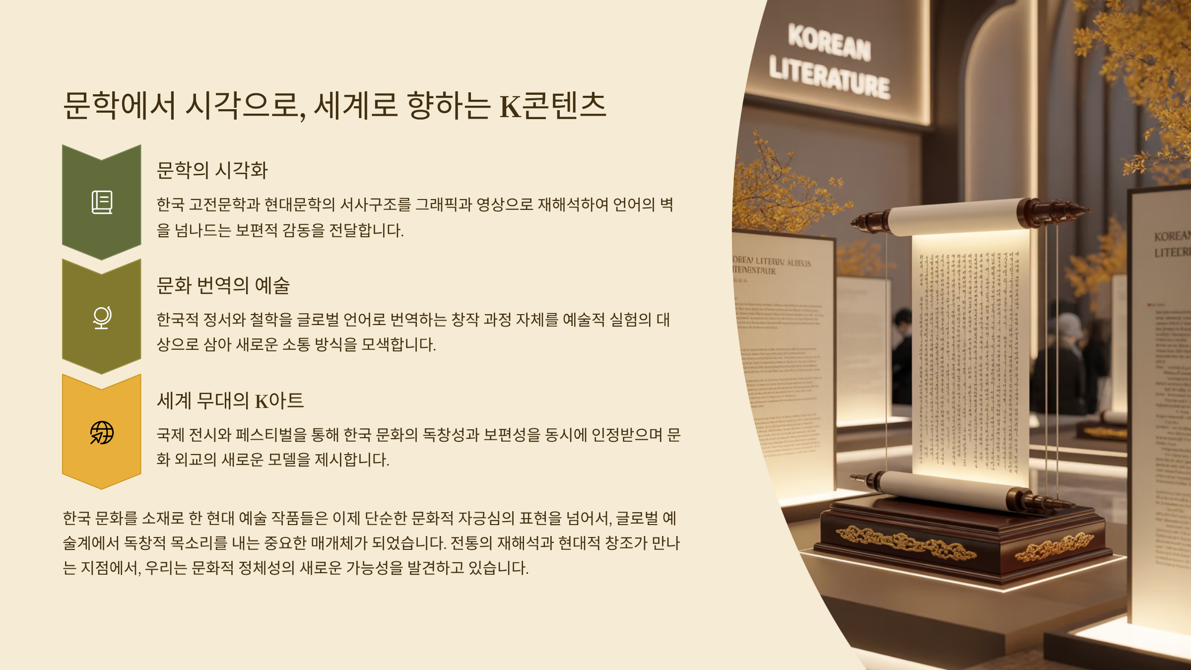 그럼 이제 다음은 한국 문학을 시각화한 작품</strong 섹션으로 넘어가볼게요. 글자와 이야기가 어떻게 이미지가 되는지 정말 멋지게 보여준 전시들이 있었답니다. 📚