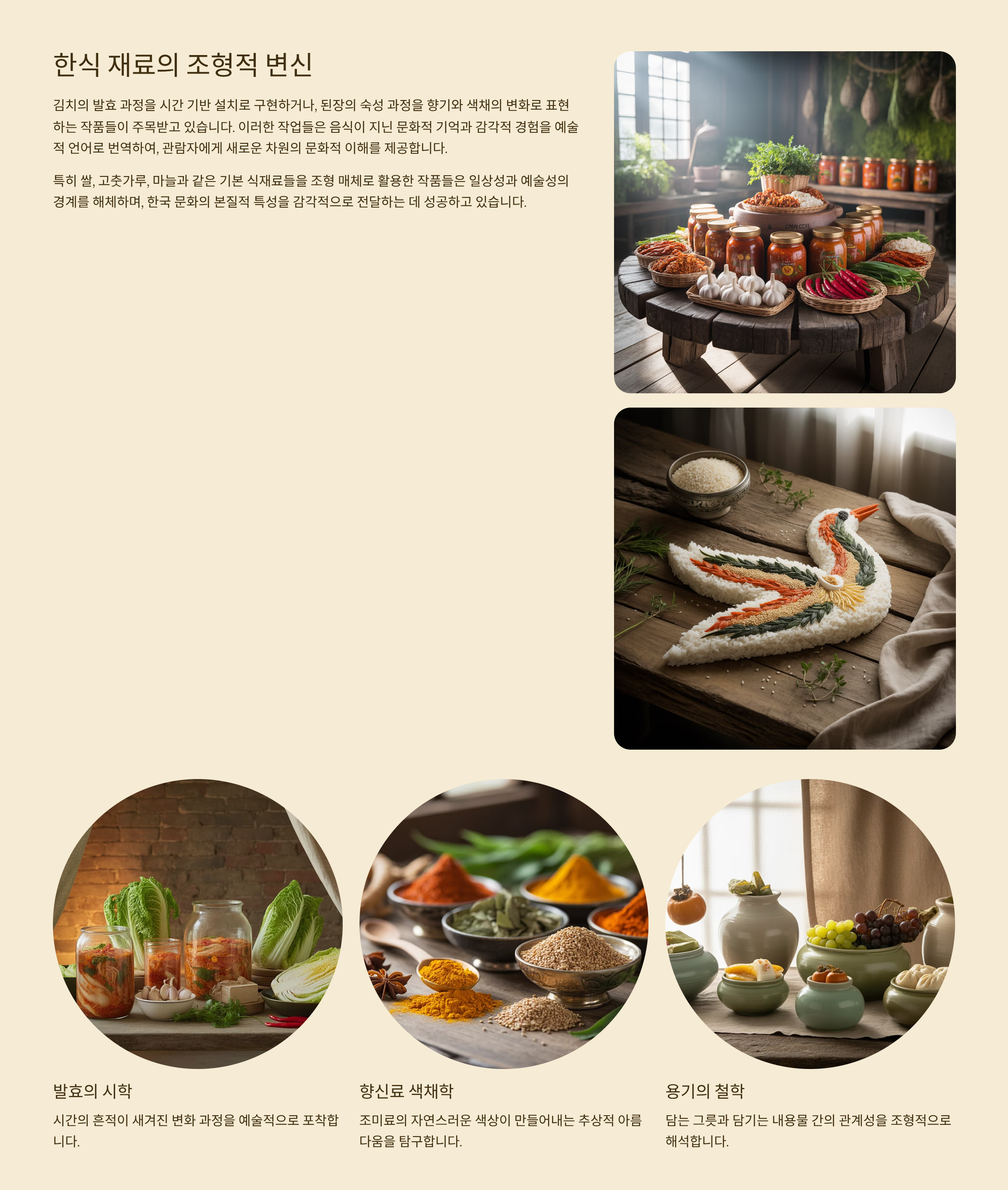 | 마른 재료(김, 무 등) | 자연건조 후 추상 조형 구성 | 한식의 언어적 재해석 |