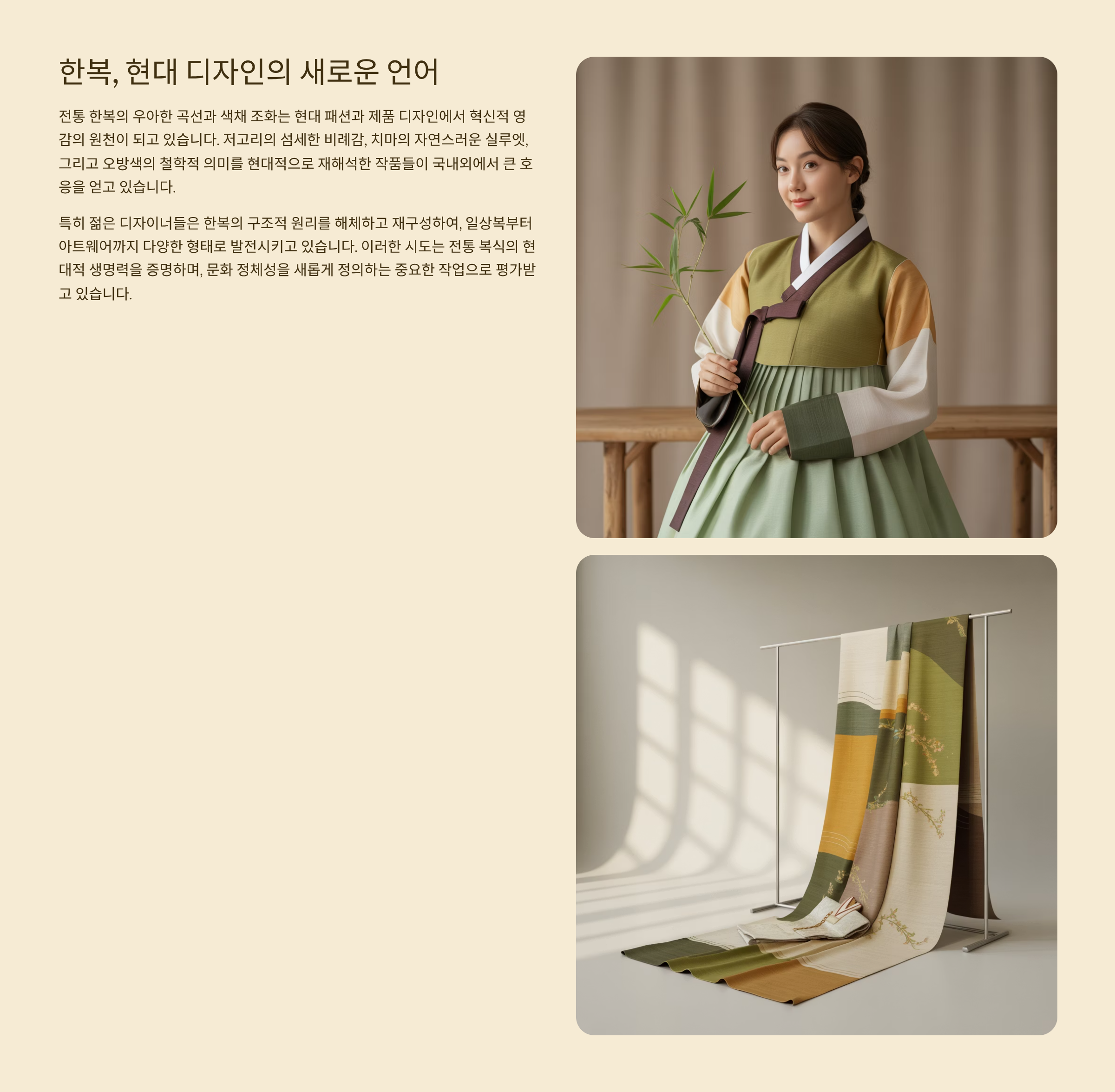 | 오방색 재해석 | 톤 다운된 색 배합 사용 | 고전미와 현대감각 조화 |