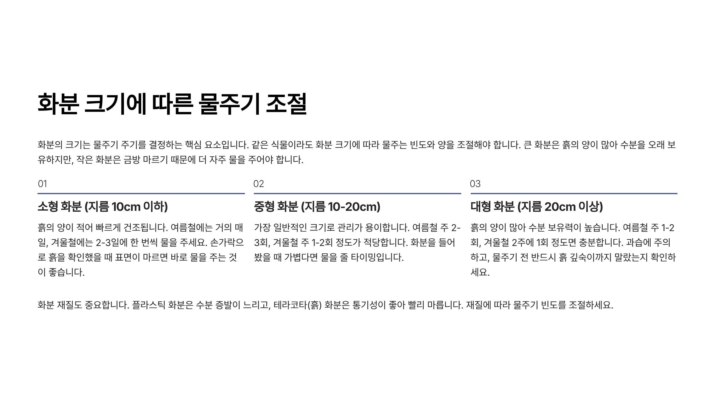 | 화분 크기 | 예상 물주기 간격 | 특징 |