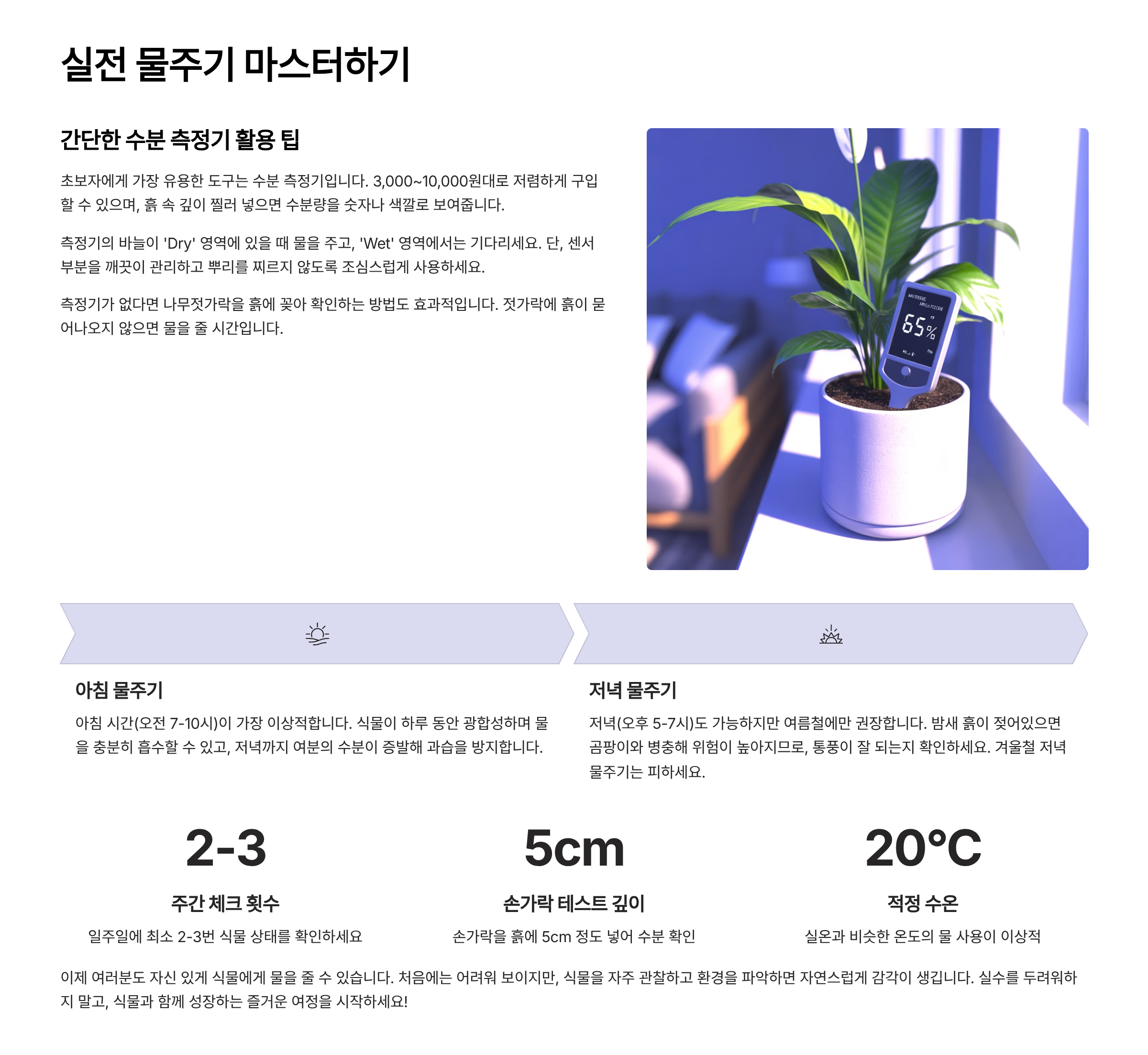 | 아침 (7~10시) | 광합성 도움, 곰팡이 예방 | 이른 시간 일어나야 함 😅 |