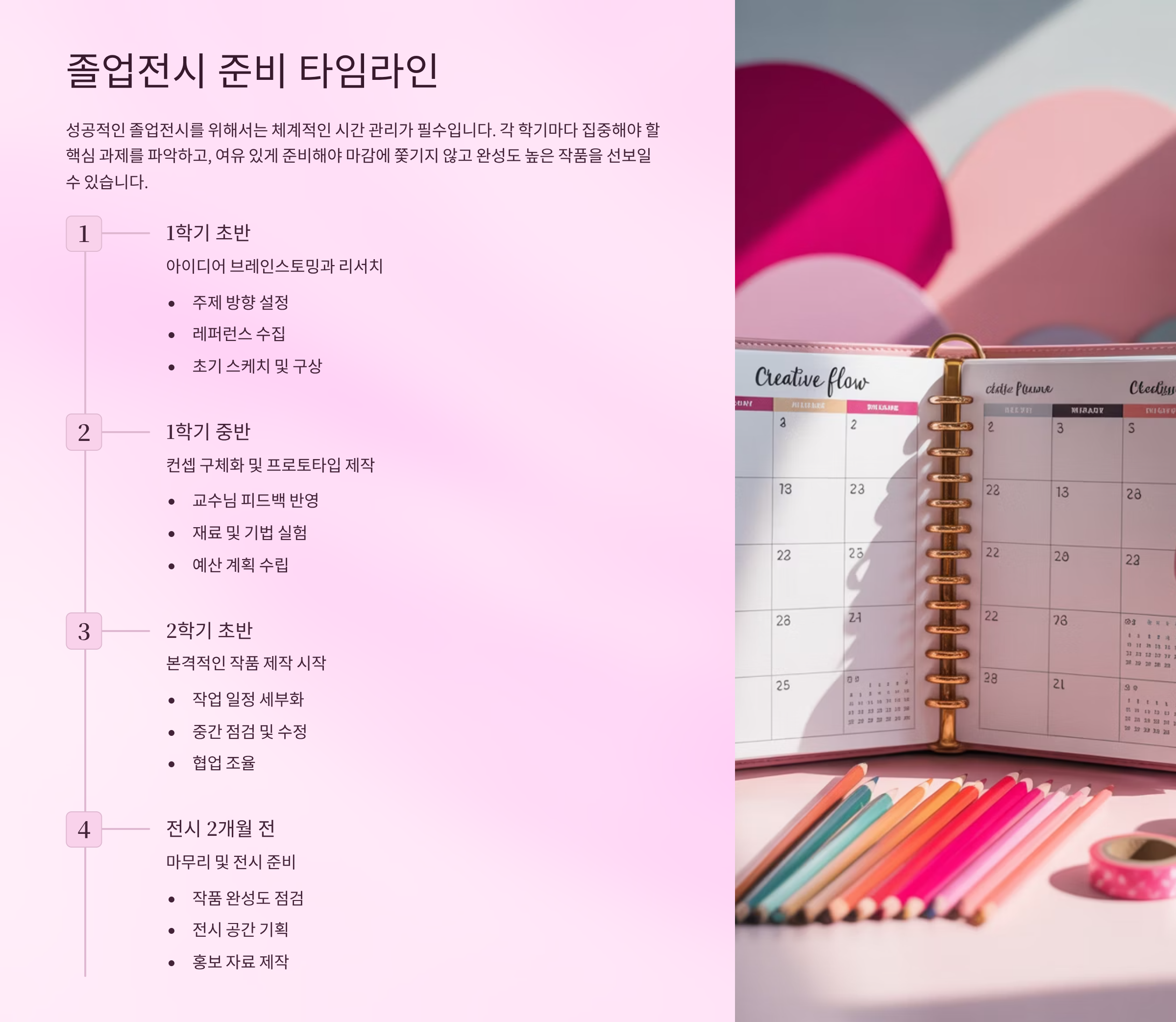 졸업전시를 성공적으로 마치기 위해선 단계별 체크리스트가 정말 중요해요. 마감 직전까지 무작정 달리는 것보다, 시기별로 무엇을 해야 하는지 정리해두면 훨씬 효율적이에요. 학기마다 꼭 챙겨야 할 핵심 포인트를 정리해볼게요.