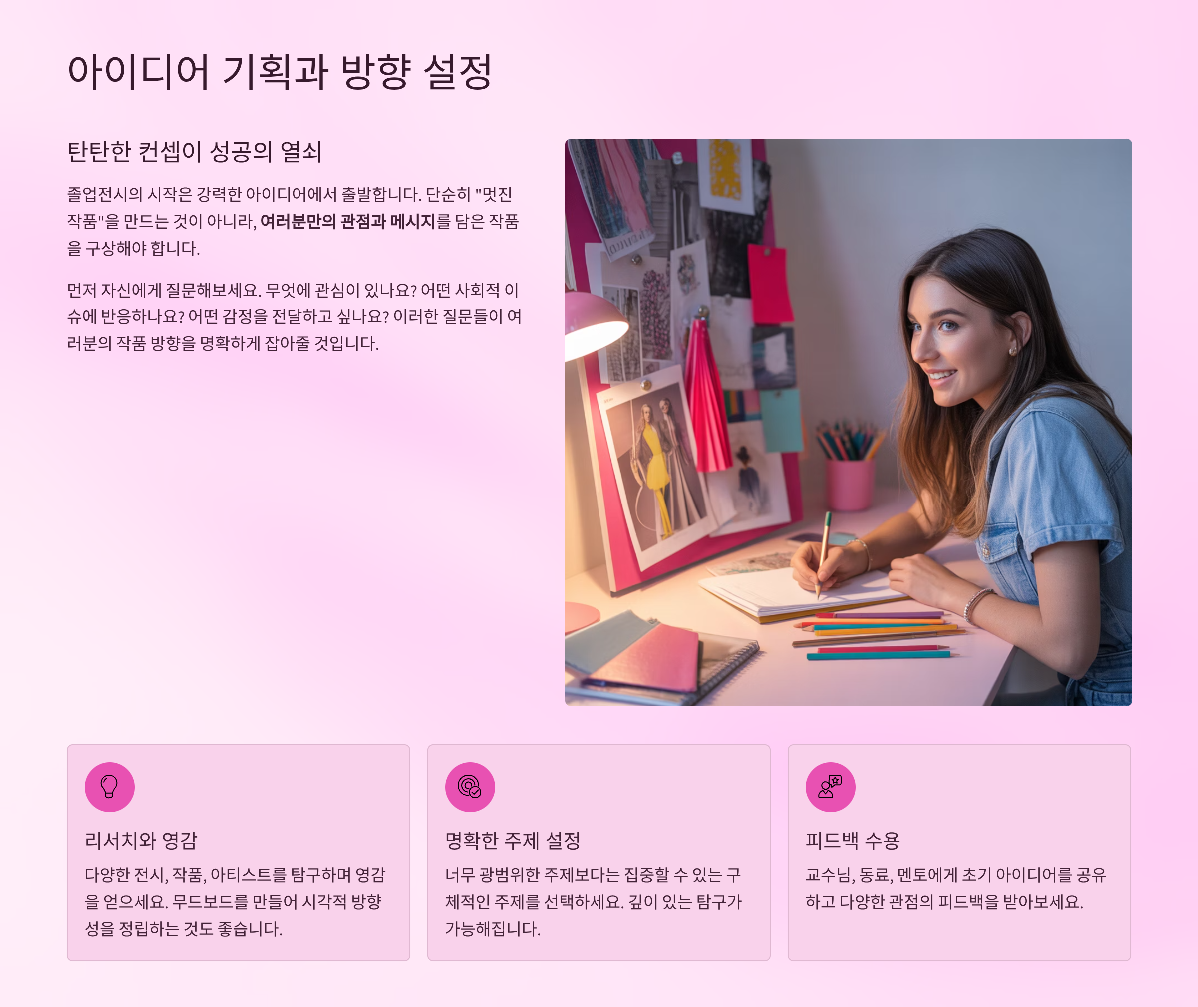실제로 졸업생 인터뷰를 보면 3학년 겨울방학부터 콘셉트 리서치를 시작한 경우도 많아요. 특히 시각디자인, 미디어아트, 패션디자인처럼 결과물이 시각적이고 촬영·설치가 중요한 전공일수록 더 빨리 움직이는 게 유리해요.