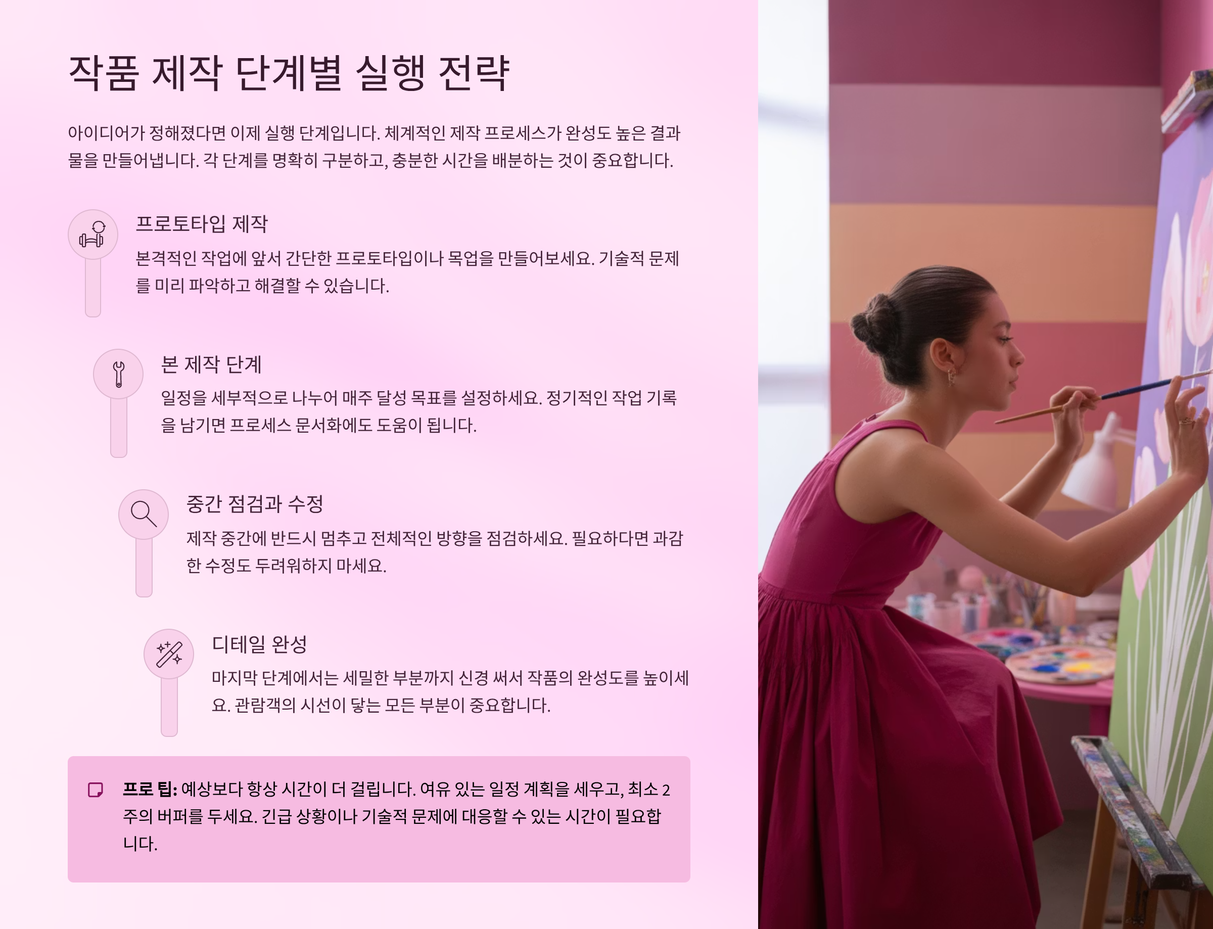 아이디어가 확정됐다면 이제부터는 실제 제작에 들어가야 해요. 이때 가장 중요한 건 일정 관리예요. 많은 학생들이 작업량을 과소평가해서 마감 직전에 몰아붙이게 되는데, 이건 정말 위험한 접근이에요.