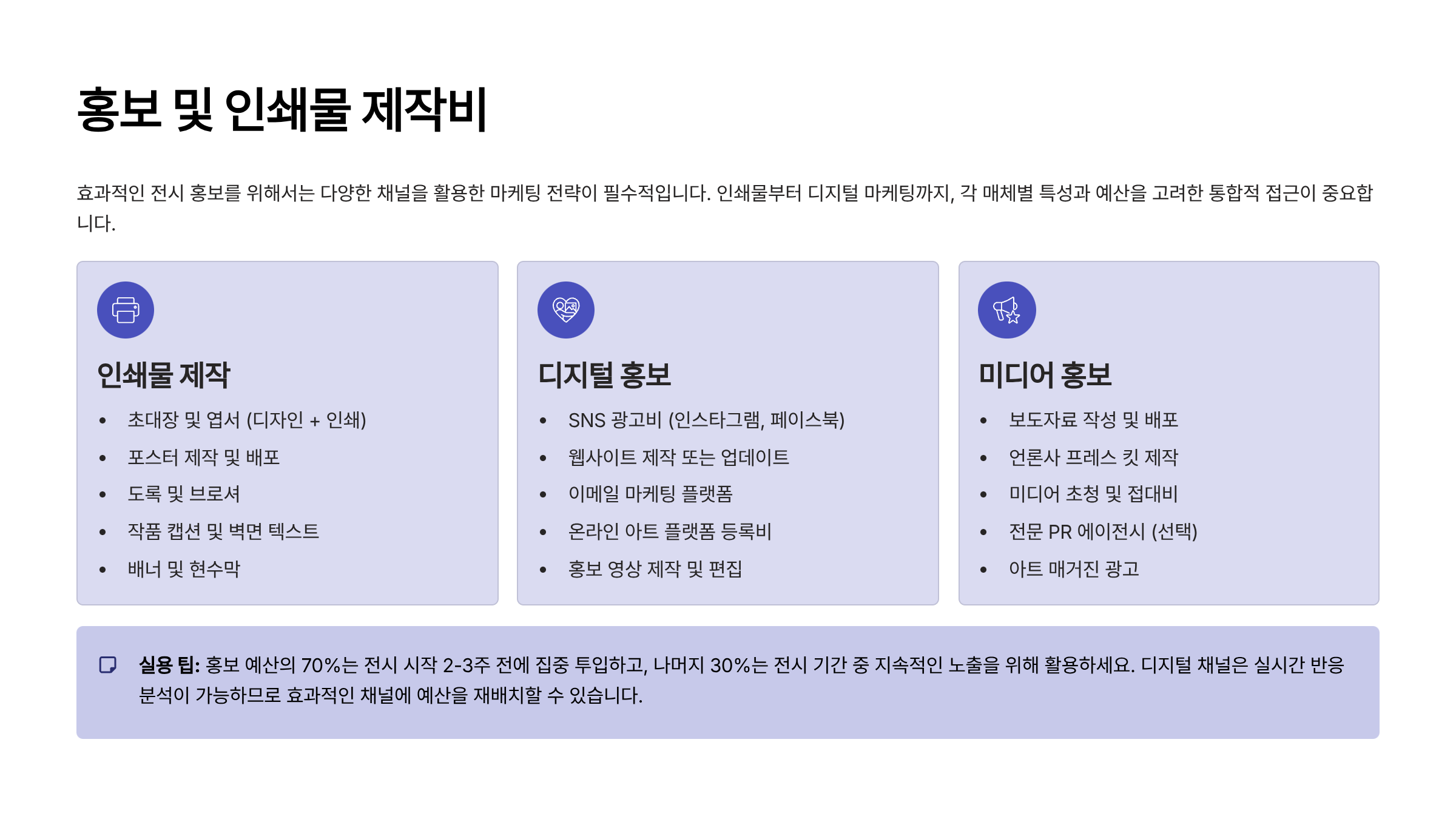디자인을 직접 하지 않는다면 디자이너 섭외비도 고려해야 해요. 포스터 1장 디자인만 해도 5만~10만 원 정도, 리플렛이나 전시 도록은 분량과 퀄리티에 따라 수십만 원까지 올라가요. 출력은 기본 100~200부 기준으로 제작해도 10만 원 이상이 소요될 수 있어요.