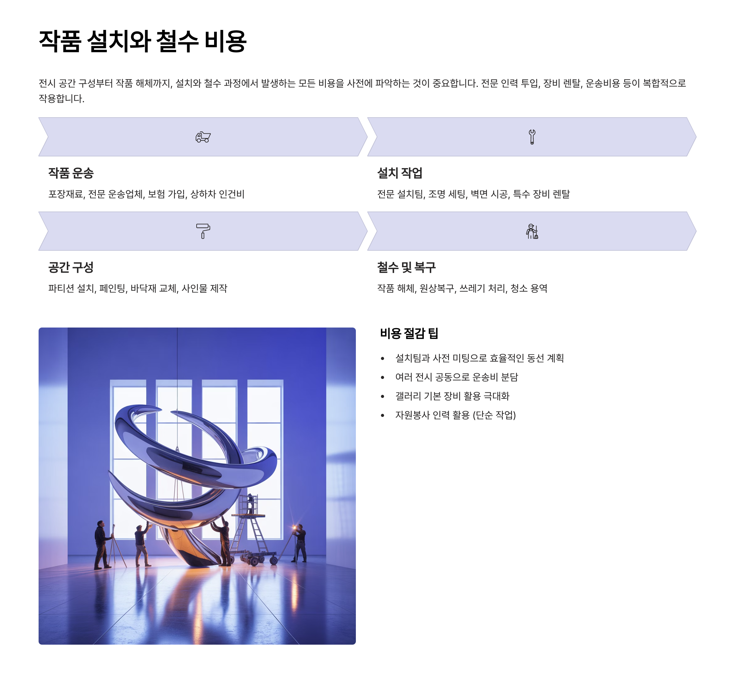 철수할 때도 작품 운반 외에 벽면 보수나 페인트칠 등 복구 작업 비용이 따로 청구될 수 있어요. 일부 갤러리는 벽면 못 자국이나 테이프 자국에도 민감해서 보증금에서 제하는 경우도 있으니 꼼꼼히 체크해야 해요.