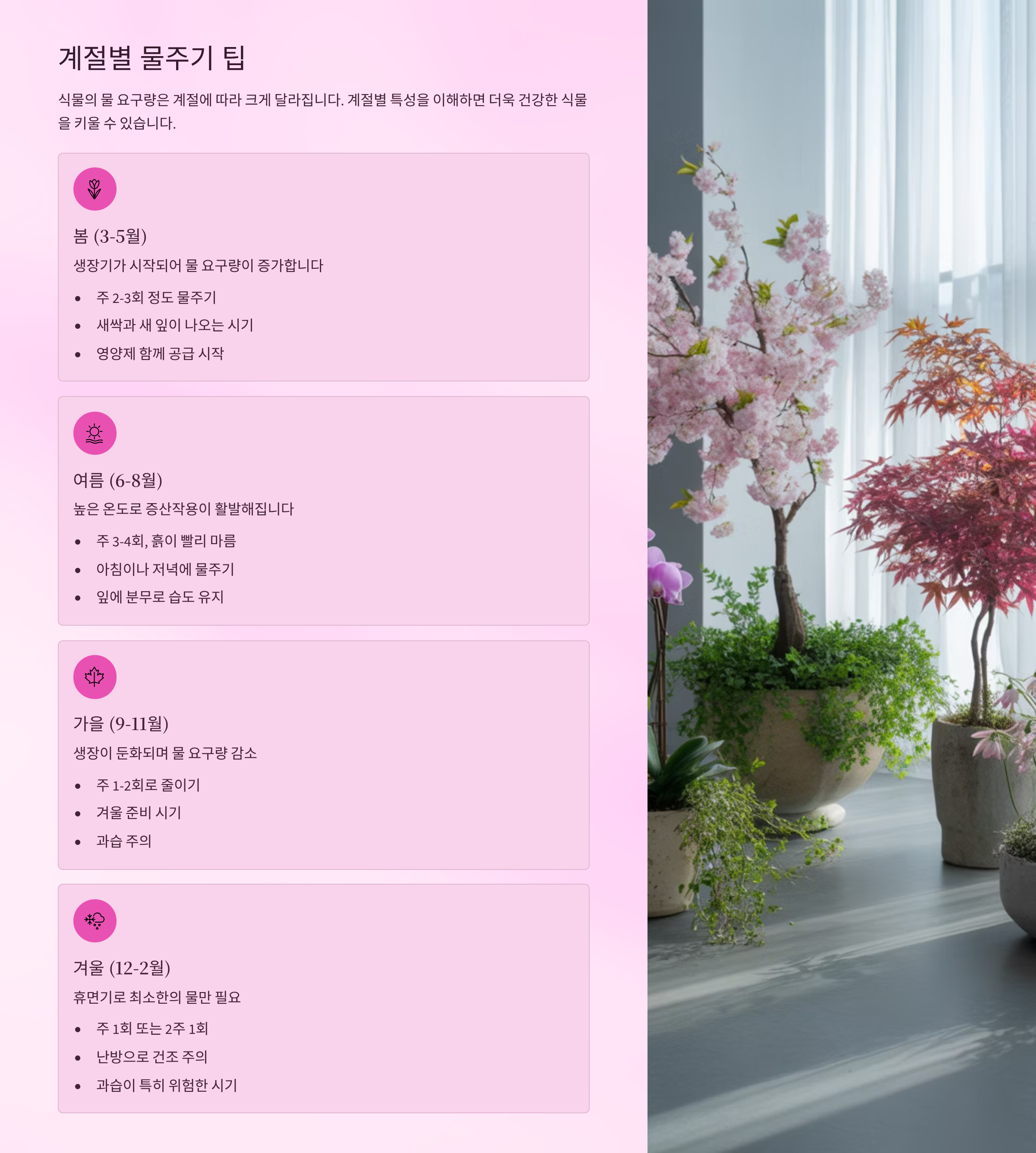 꽃이 피는 식물은 생장기 동안 수분을 많이 필요로 하지만, 개화가 끝난 후에는 수분 요구량이 줄어들어요. 그 시점에 맞춰 물주기 간격도 조절해 줘야 해요. 그리고 잎이 얇고 크기가 큰 식물은 증산 작용이 활발하기 때문에 물을 더 자주 줘야 해요.