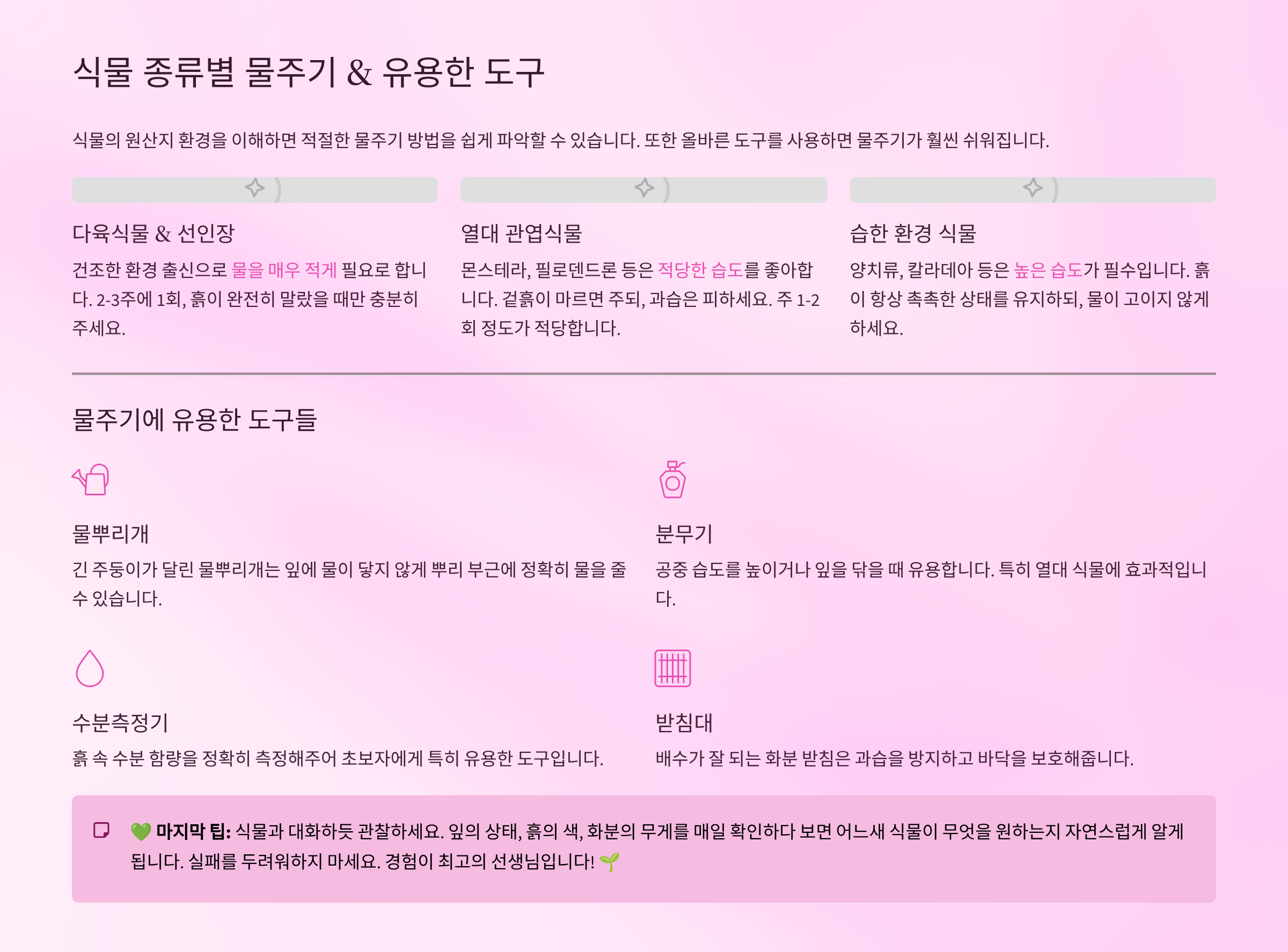 내가 생각했을 때 가장 실수하기 쉬운 부분이 바로 ‘모든 식물에게 똑같이 물을 주는 것’인 것 같아요. 식물마다 고유한 물주기 리듬이 있어서, 그 특성을 이해하는 게 진짜 반려식물로 키우는 첫걸음이에요. 물주기는 결국 ‘관찰’에서 시작된답니다!