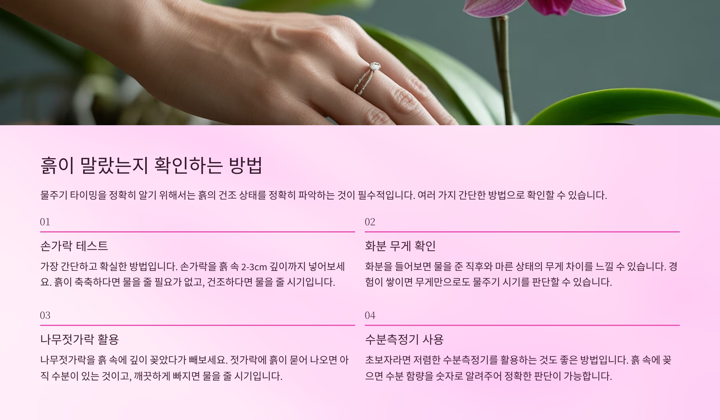 | 손가락 테스트 | 간편하고 도구 불필요 | 깊은 흙 확인 어려움 |