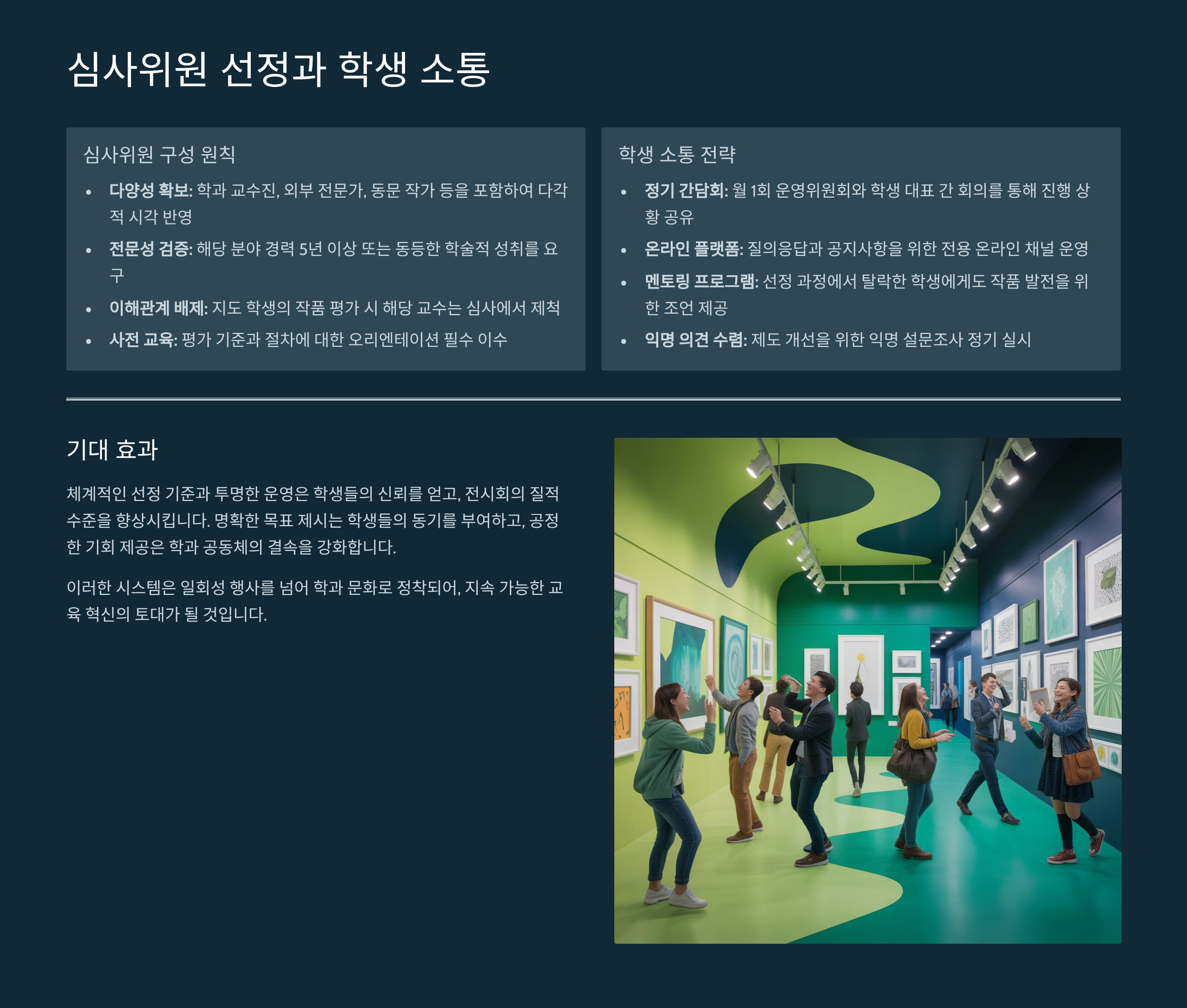 이렇게 절차를 세분화하고 사전 공유하면, 학생들이 결과에 납득할 수 있는 분위기가 형성돼요. 불필요한 오해와 분란 없이 모두가 신뢰하는 전시회가 될 수 있답니다. 🙌