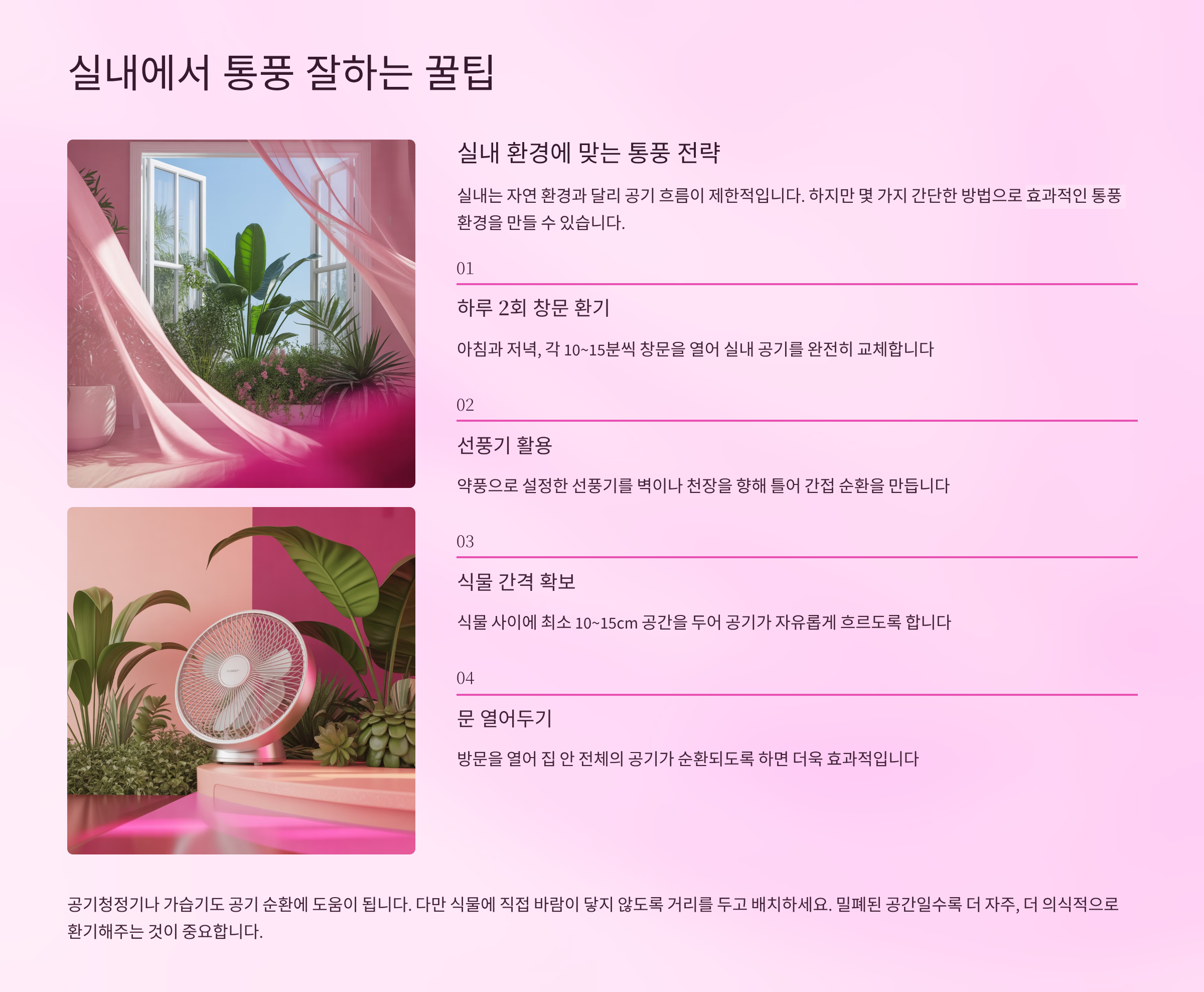 실내에서 식물을 키울 때 가장 어려운 게 바로 '자연스러운 통풍'이에요. 창문을 자주 열지 않거나, 밀폐된 방에서 식물을 두면 공기가 정체돼 곰팡이, 해충, 무름병이 발생하기 쉬워요. 그래서 특별한 노하우가 필요하답니다.