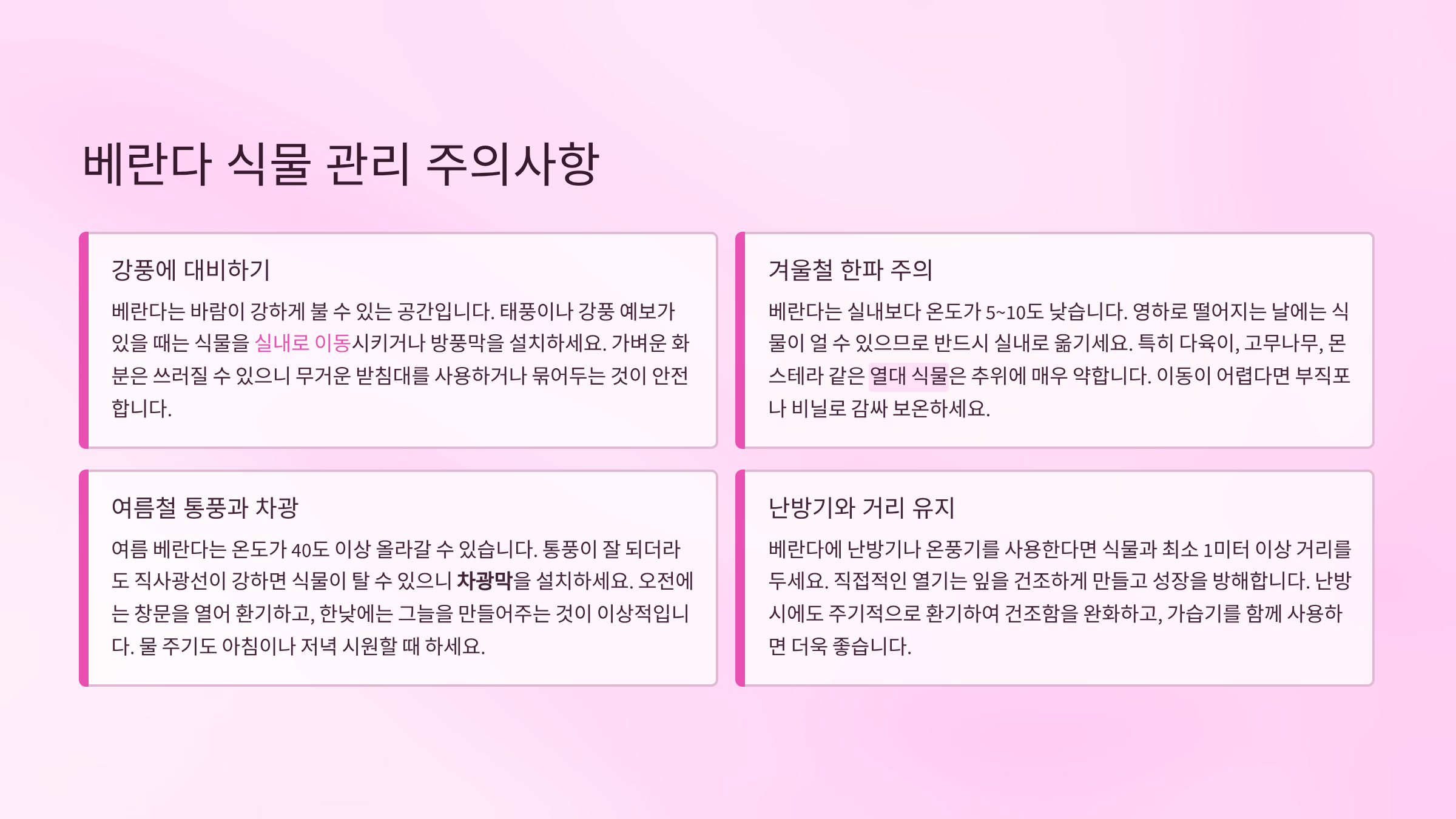 각 계절의 날씨, 온도 변화, 빛의 방향까지 고려하면서 식물의 위치나 통풍 방법을 달리해야 식물이 1년 내내 건강하게 자랄 수 있어요. 계절에 따라 정기적으로 식물 위치를 옮겨주는 것도 큰 도움이 돼요.
