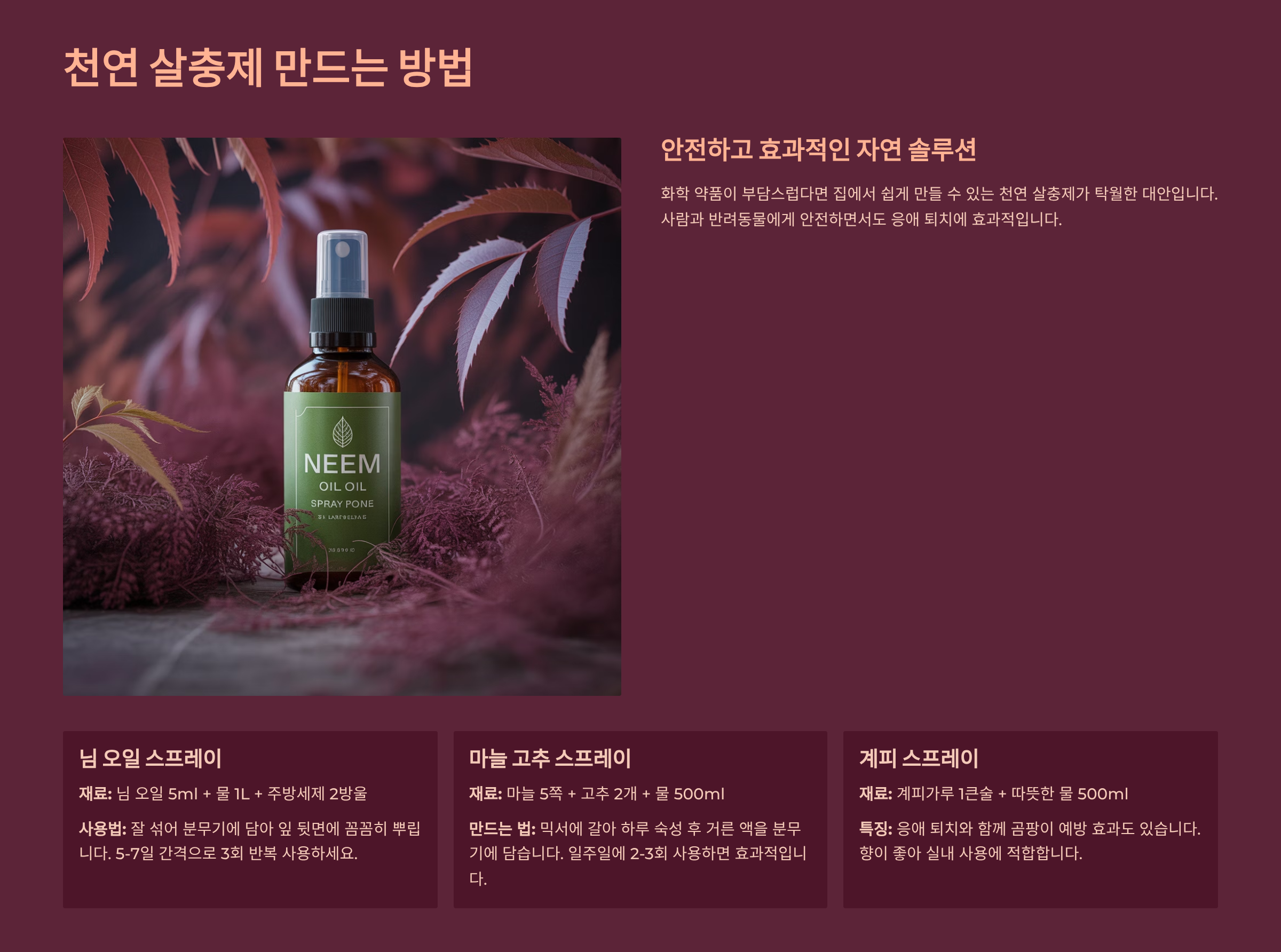 식물에 직접 닿는 제품은 되도록 화학 성분이 적은 것이 좋아요. 특히 집안에서 키우는 반려식물이라면 천연 살충제를 만들어 사용하는 걸 추천해요. 만들기도 간단하고 응애에도 꽤 효과가 있어요!