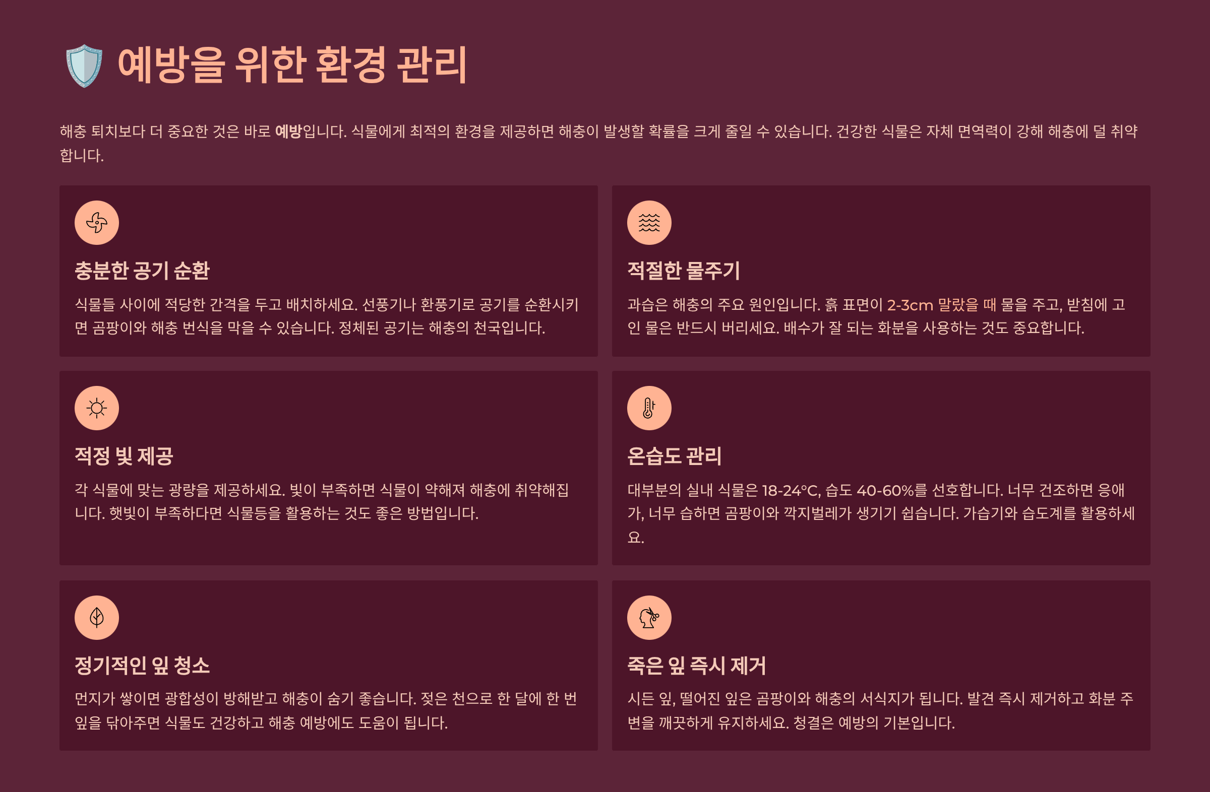 이 해충들은 대부분 과습, 통풍 부족, 밀집된 식물 배치에서 발생하곤 해요. 즉, 사람이 보기엔 멀쩡해 보여도 식물 입장에서는 해충이 서식하기 좋은 환경일 수 있다는 말이에요. 습한 공간과 오염된 흙은 특히 주의해야 해요.