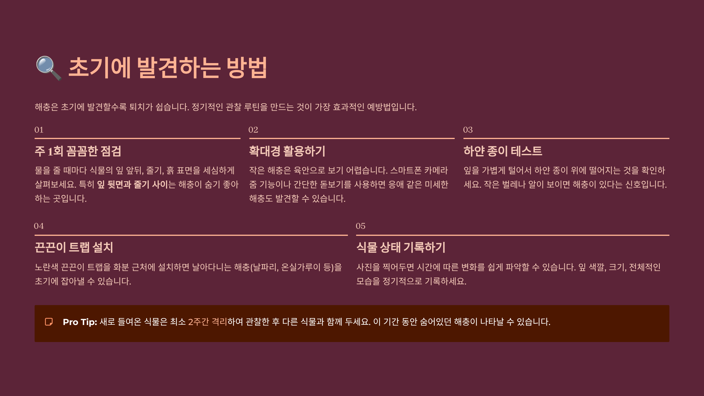 또한 계절 변화, 특히 여름철 고온다습한 환경은 해충 발생률을 높여요. 실내라고 안심하기엔 너무 위험하죠. 그래서 주기적인 관찰과 초미세 변화 감지는 필수예요.