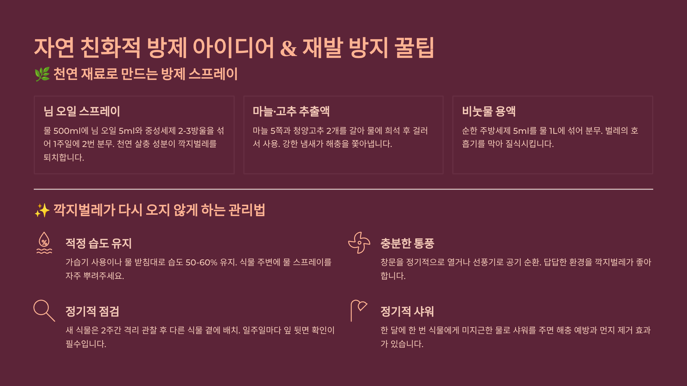 또한 계피 스프레이나 식초 희석액도 해충 방지에 도움을 줄 수 있어요. 단, 민감한 식물에는 소량만 테스트한 후 사용하는 것이 안전해요.