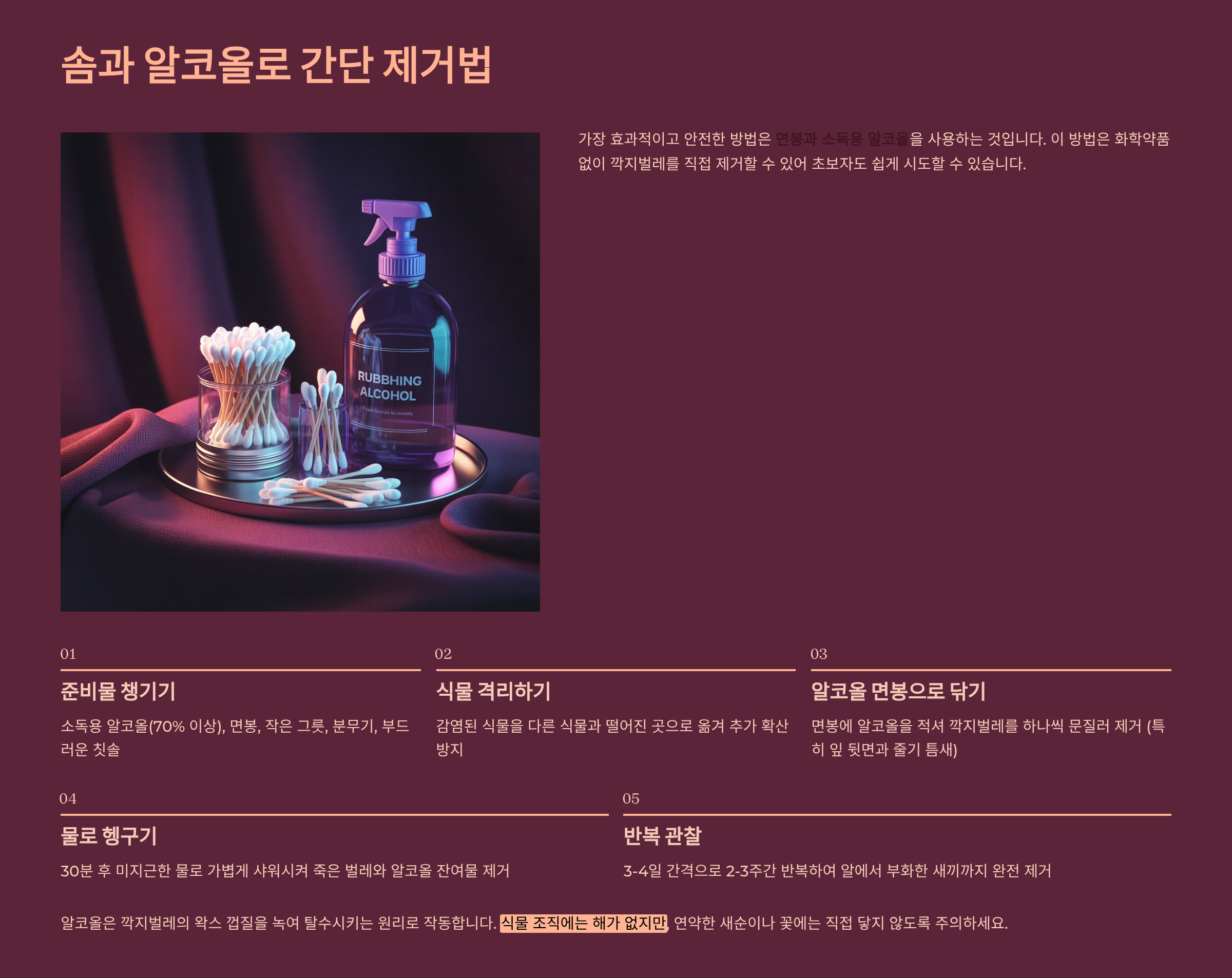 방법은 정말 쉬워요. 화장솜이나 면봉에 알코올을 묻힌 후, 벌레가 있는 부분을 조심스럽게 닦아주기만 하면 된답니다. 알코올이 곧바로 깍지벌레의 외피를 파괴해 죽게 만들어줘요.