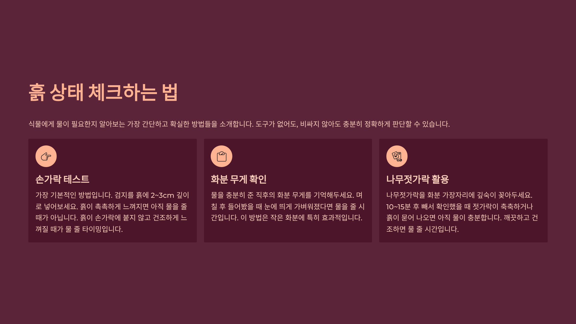 | 손가락 체크 | 맨손 | 가장 간편하고 무료 | 흙에 손을 넣기 싫은 사람에겐 비추천 |